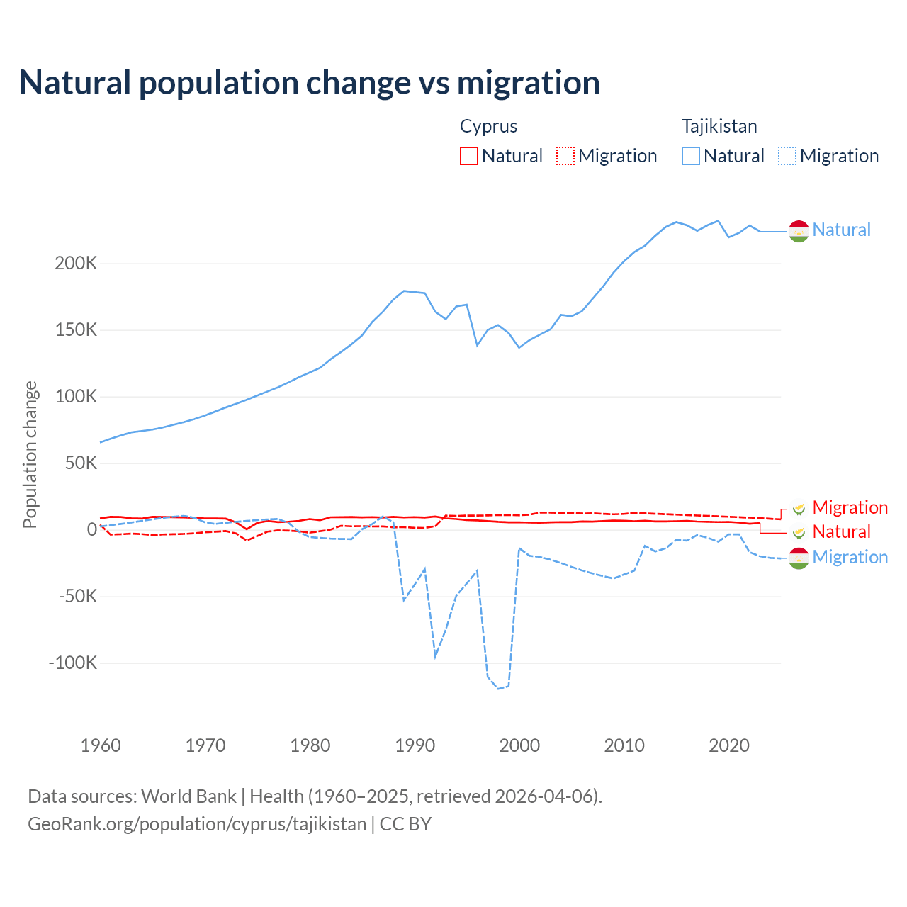 Over the last 10 years, 36.2% of the population change in Cyprus is from natural causes (a gain of 57,464 people) and 63.8% is from migration (a gain of 101,458 people). In Tajikistan 96% is from natural causes (a gain of 2,266,045 people) and 3.95% is from migration (a loss of 93,205 people).
