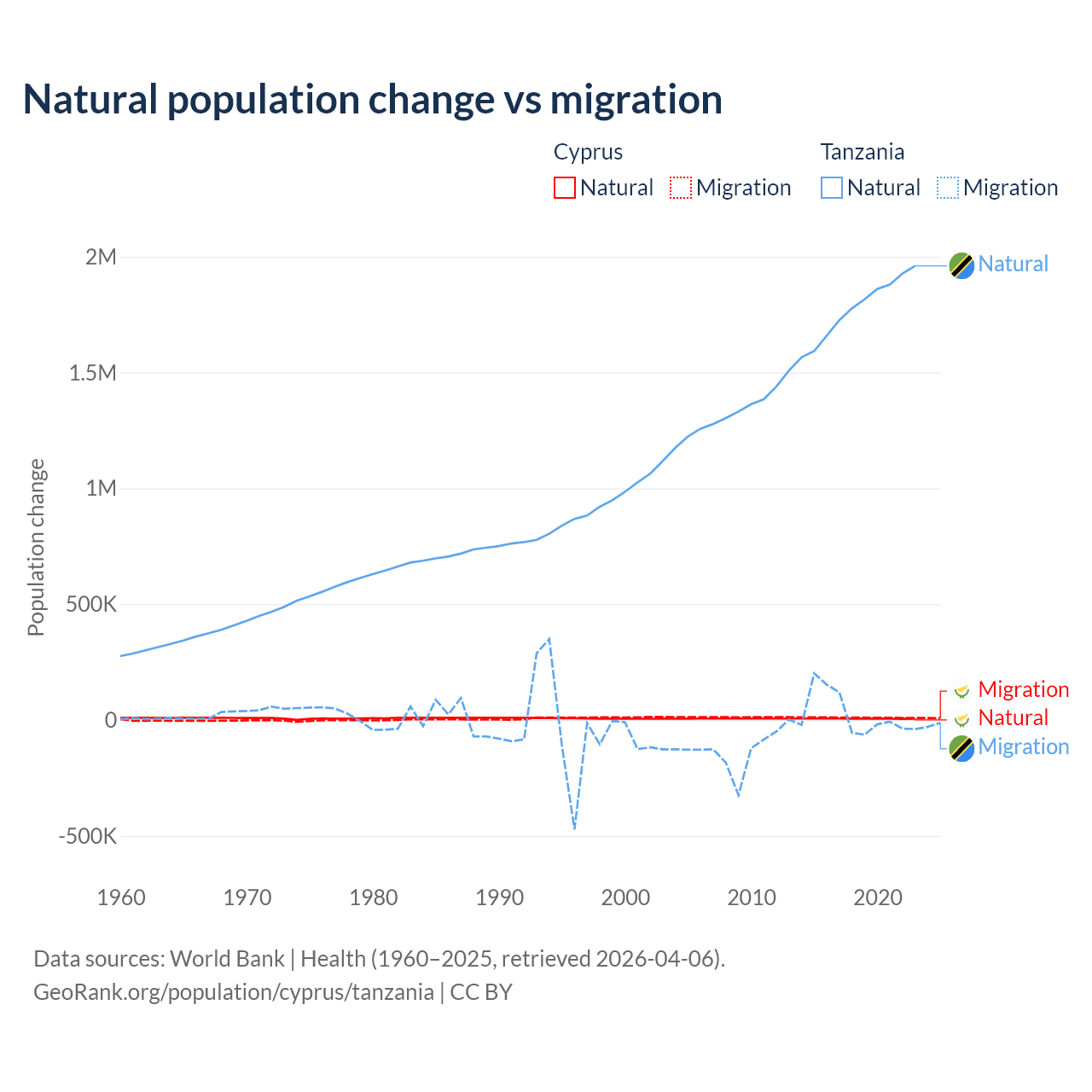 Over the last 10 years, 36.2% of the population change in Cyprus is from natural causes (a gain of 57,464 people) and 63.8% is from migration (a gain of 101,458 people). In Tanzania 98.7% is from natural causes (a gain of 17,769,541 people) and 1.27% is from migration (a gain of 229,466 people).