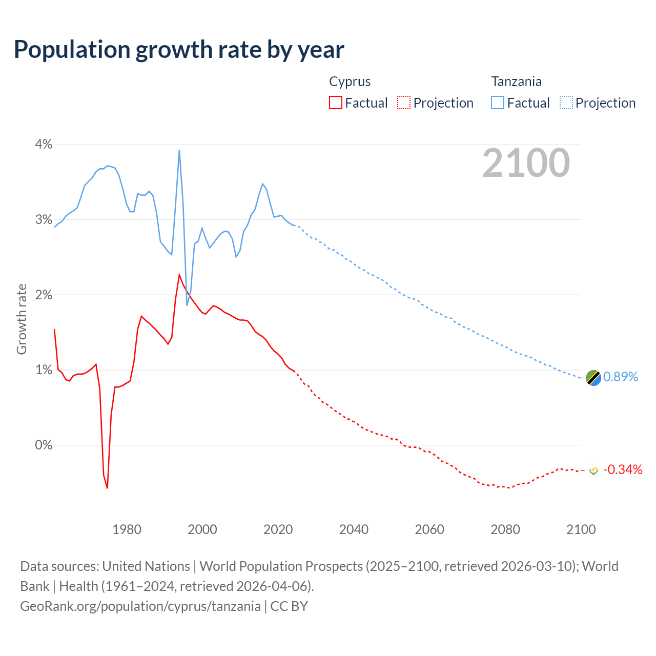 - For the last 10 years, Cyprus has had an average growth rate of +1.26% per year vs +3.13% in Tanzania.