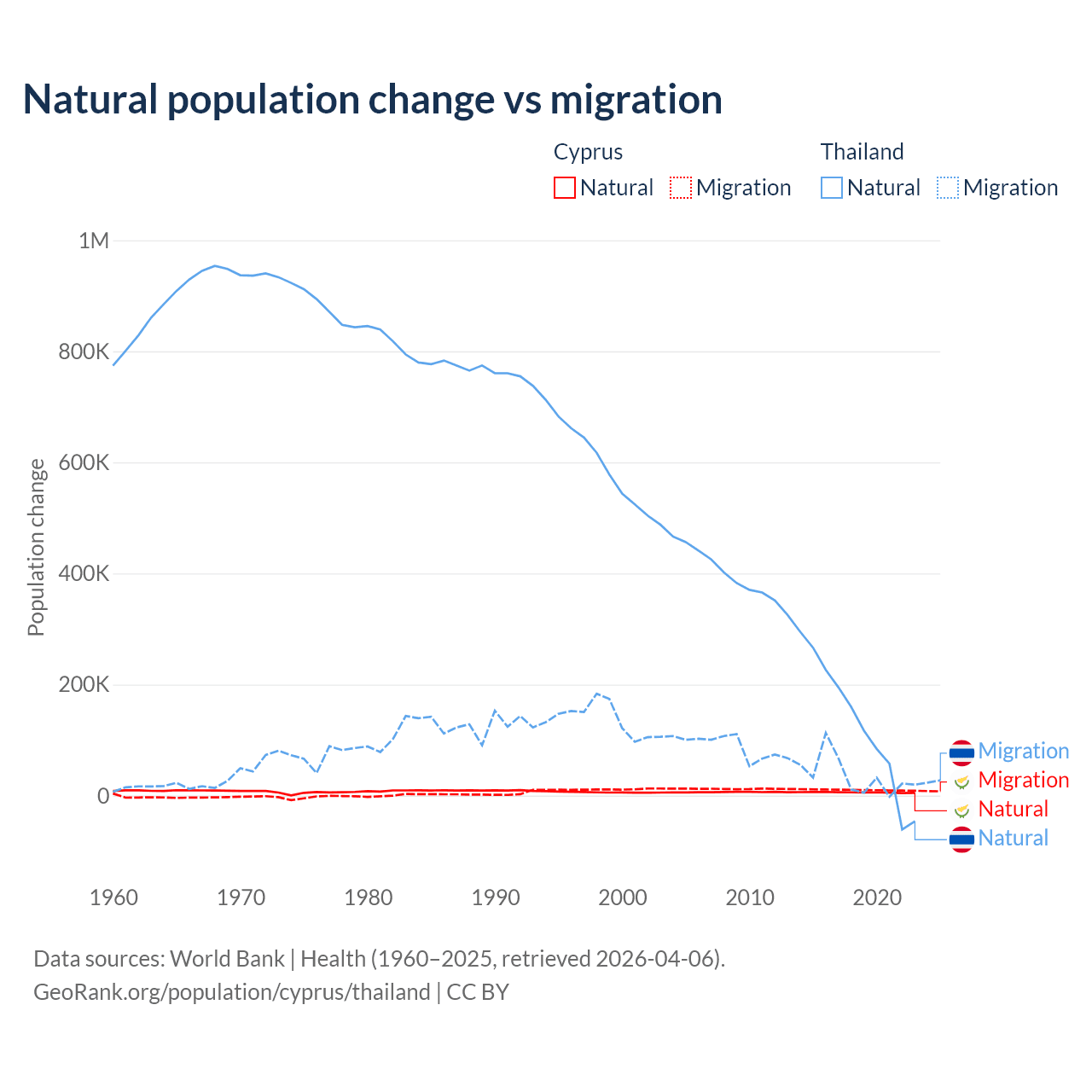 Over the last 10 years, 36.2% of the population change in Cyprus is from natural causes (a gain of 57,464 people) and 63.8% is from migration (a gain of 101,458 people). In Thailand 78.4% is from natural causes (a gain of 1,292,528 people) and 21.6% is from migration (a gain of 355,361 people).