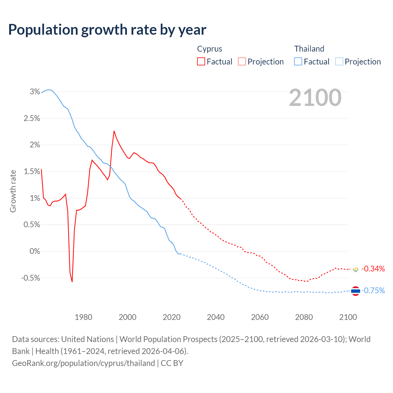 - For the last 10 years, Cyprus has had an average growth rate of +1.26% per year vs +0.23% in Thailand.