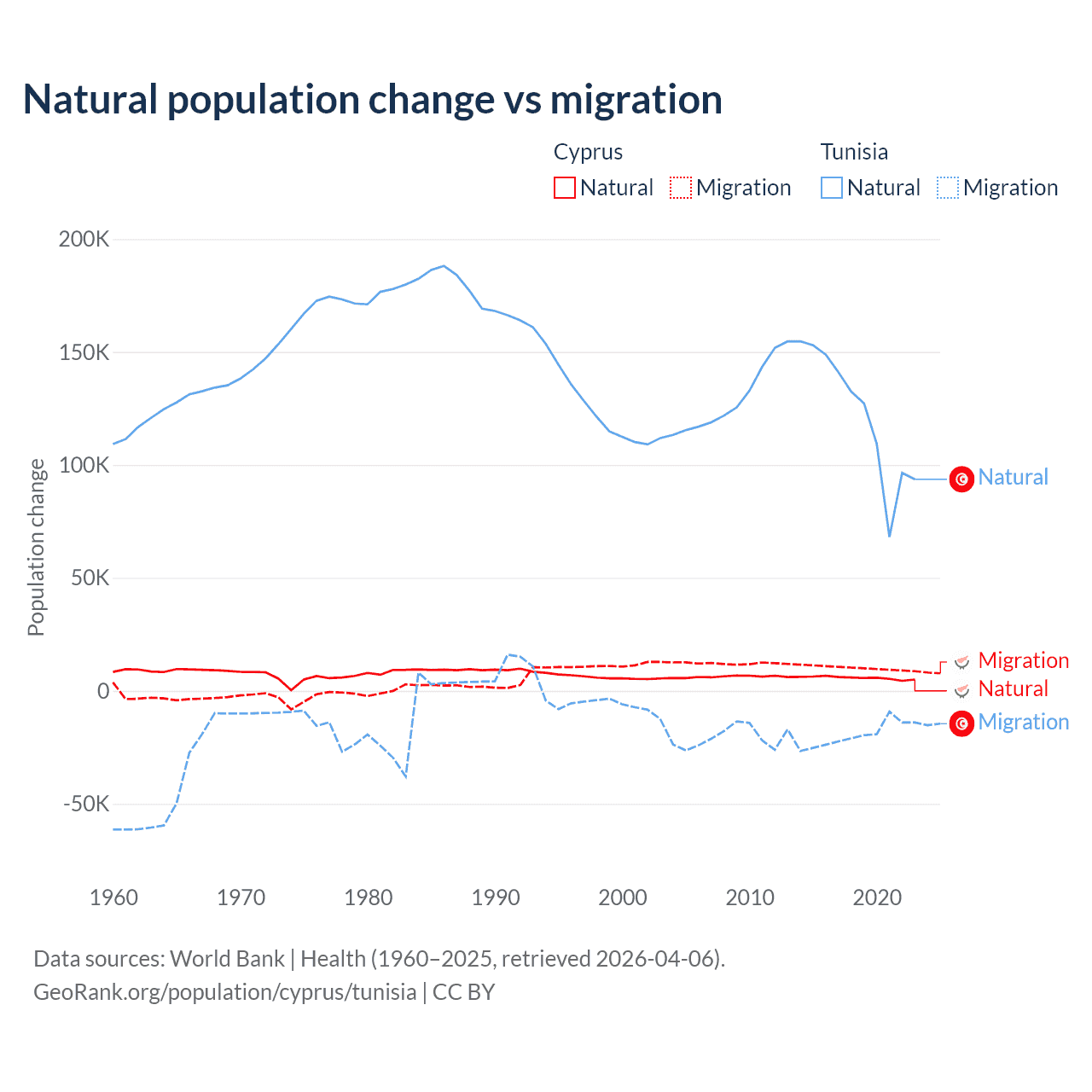 Over the last 10 years, 36.2% of the population change in Cyprus is from natural causes (a gain of 57,464 people) and 63.8% is from migration (a gain of 101,458 people). In Tunisia 86.3% is from natural causes (a gain of 1,225,079 people) and 13.7% is from migration (a loss of 195,011 people).