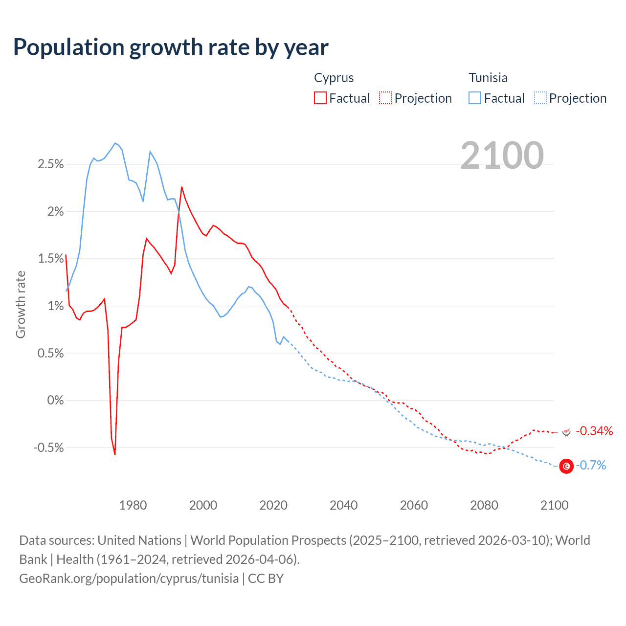 - For the last 10 years, Cyprus has had an average growth rate of +1.26% per year vs +0.89% in Tunisia.
