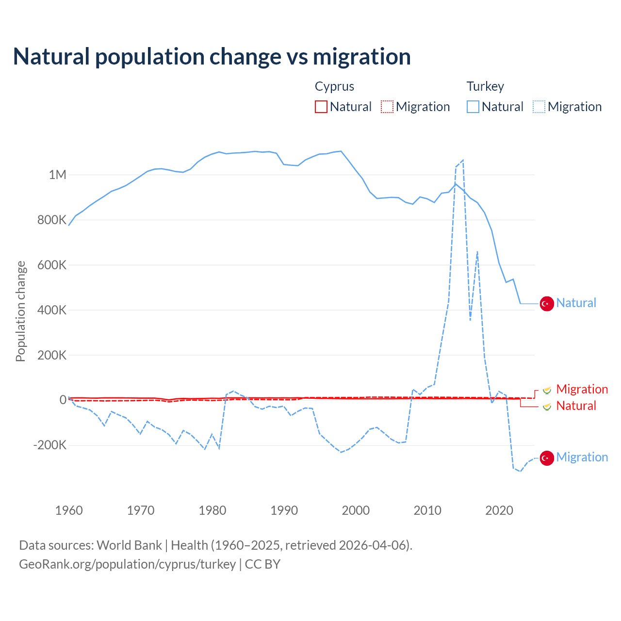 Over the last 10 years, 36.2% of the population change in Cyprus is from natural causes (a gain of 57,464 people) and 63.8% is from migration (a gain of 101,458 people). In Turkey 73% is from natural causes (a gain of 7,333,352 people) and 27% is from migration (a gain of 2,718,916 people).