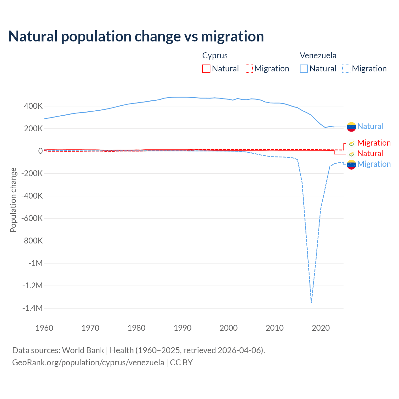 Over the last 10 years, 36.2% of the population change in Cyprus is from natural causes (a gain of 57,464 people) and 63.8% is from migration (a gain of 101,458 people). In Venezuela 38.6% is from natural causes (a gain of 2,946,257 people) and 61.4% is from migration (a loss of 4,683,227 people).