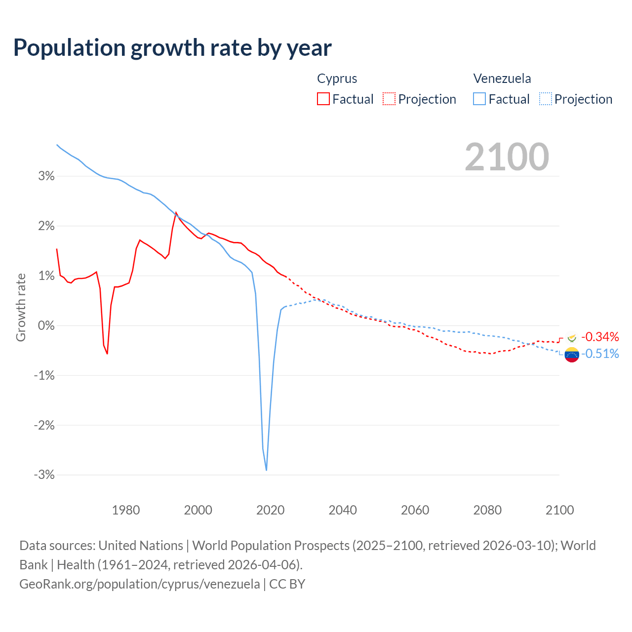 - For the last 10 years, Cyprus has had an average growth rate of +1.26% per year vs -0.46% in Venezuela.