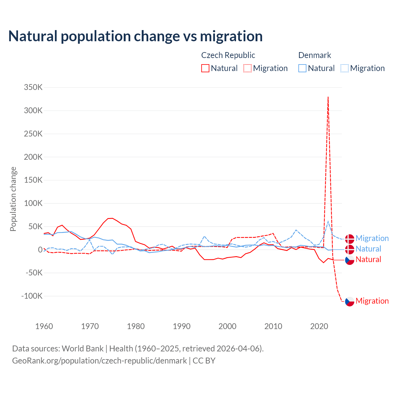 Over the last 10 years, 17.3% of the population change in the Czech Republic is from natural causes (a loss of 74,826 people) and 82.7% is from migration (a gain of 357,502 people). In Denmark 15.4% is from natural causes (a gain of 51,826 people) and 84.6% is from migration (a gain of 284,848 people).