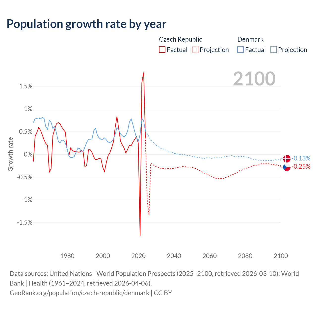 - For the last 10 years, the Czech Republic has had an average growth rate of +0.34% per year vs +0.57% in Denmark.