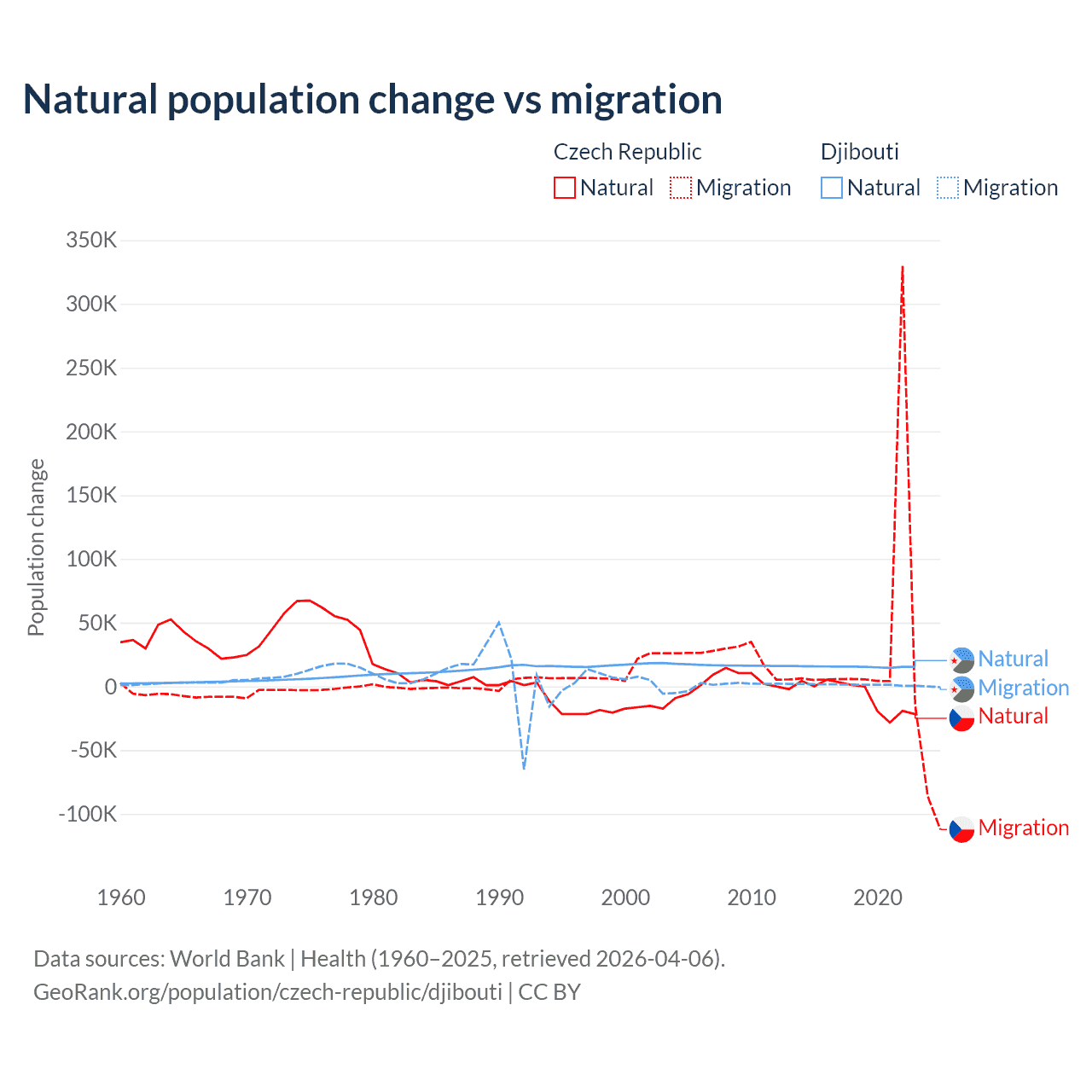 Over the last 10 years, 17.3% of the population change in the Czech Republic is from natural causes (a loss of 74,826 people) and 82.7% is from migration (a gain of 357,502 people). In Djibouti 92.1% is from natural causes (a gain of 153,892 people) and 7.87% is from migration (a gain of 13,138 people).
