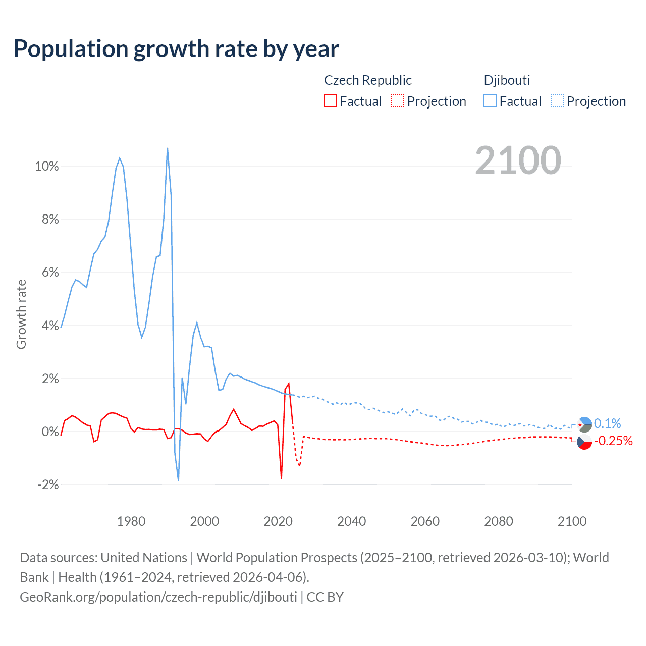 - For the last 10 years, the Czech Republic has had an average growth rate of +0.34% per year vs +1.57% in Djibouti.