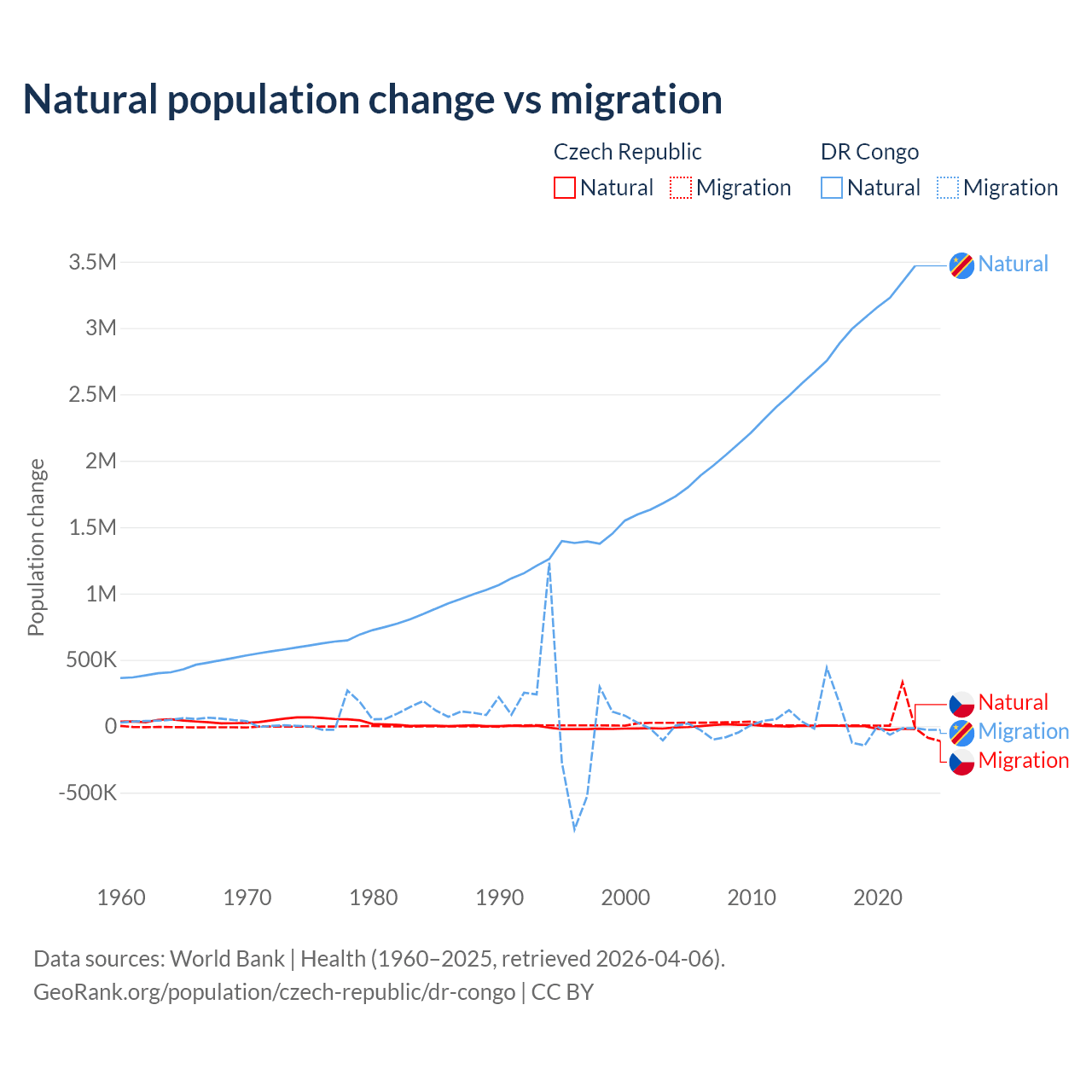 Over the last 10 years, 17.3% of the population change in the Czech Republic is from natural causes (a loss of 74,826 people) and 82.7% is from migration (a gain of 357,502 people). In the DR Congo 99.1% is from natural causes (a gain of 30,150,516 people) and 0.89% is from migration (a gain of 270,872 people).