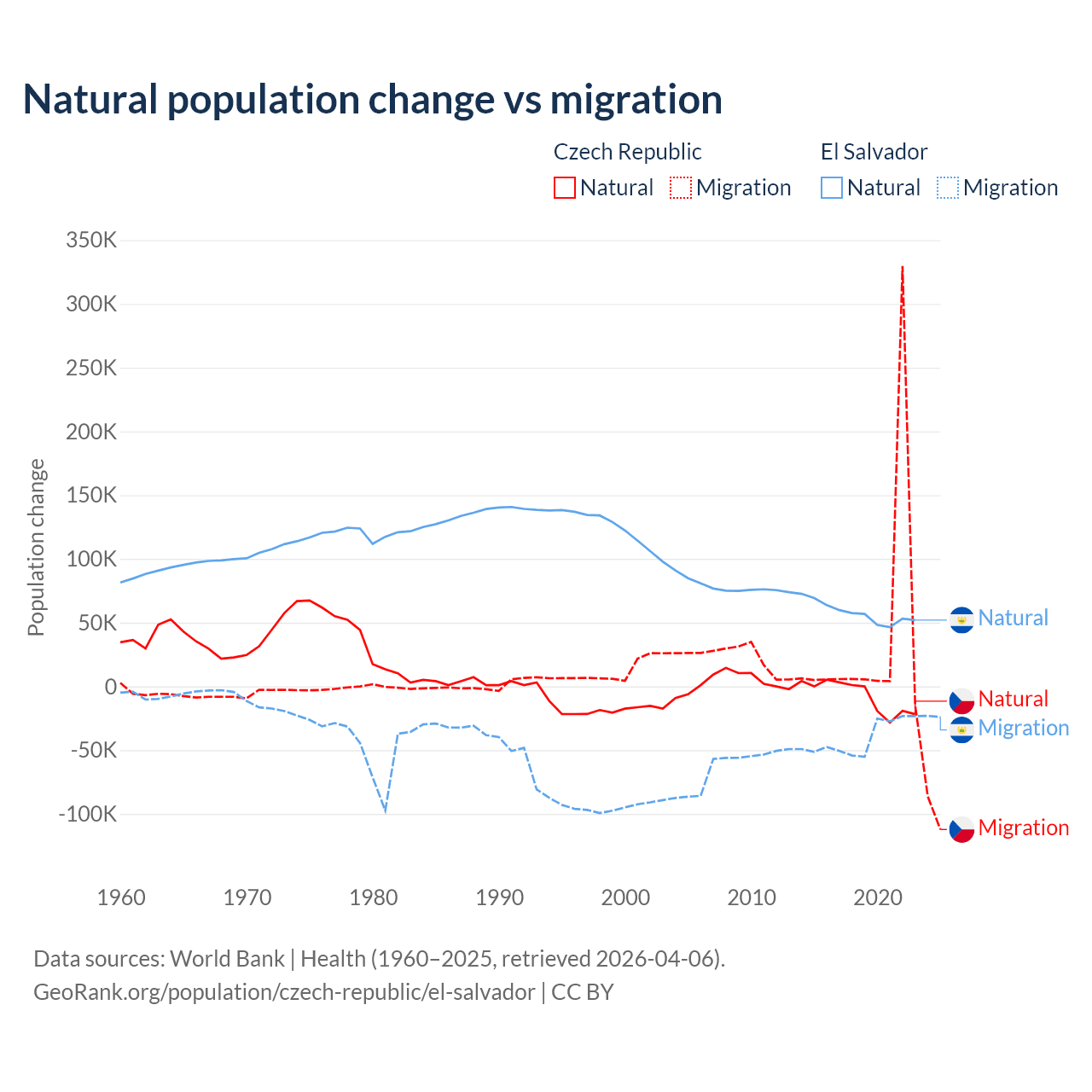 Over the last 10 years, 17.3% of the population change in the Czech Republic is from natural causes (a loss of 74,826 people) and 82.7% is from migration (a gain of 357,502 people). In El Salvador 58.8% is from natural causes (a gain of 579,641 people) and 41.2% is from migration (a loss of 406,874 people).