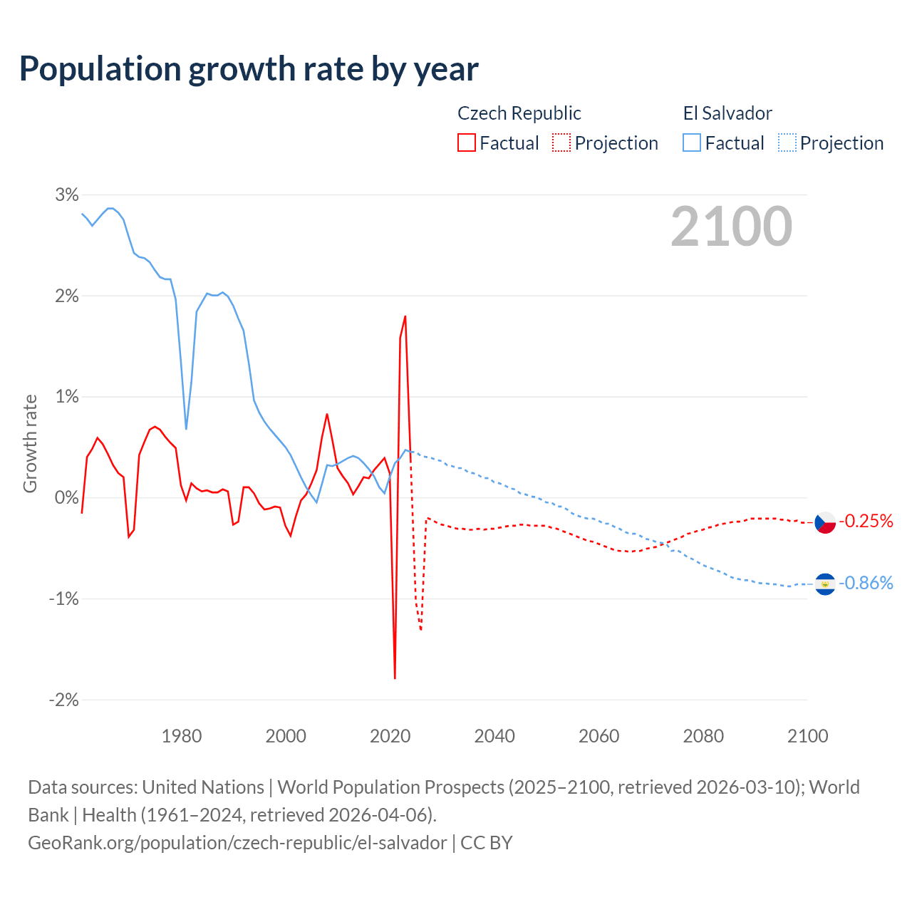 - For the last 10 years, the Czech Republic has had an average growth rate of +0.34% per year vs +0.29% in El Salvador.