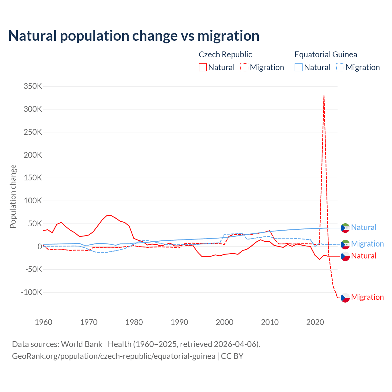 Over the last 10 years, 17.3% of the population change in the Czech Republic is from natural causes (a loss of 74,826 people) and 82.7% is from migration (a gain of 357,502 people). In Equatorial Guinea 77% is from natural causes (a gain of 382,745 people) and 23% is from migration (a gain of 114,024 people).