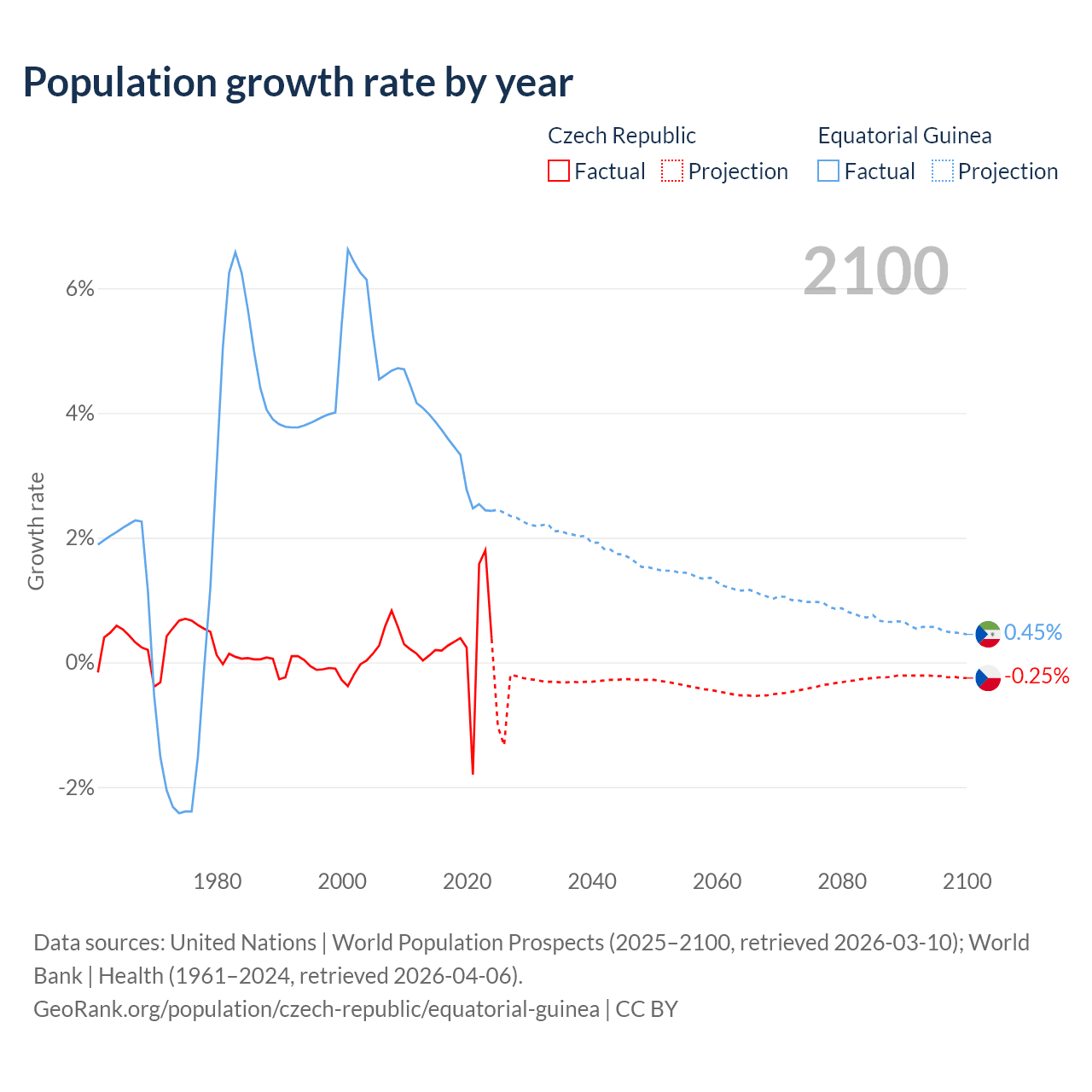 - For the last 10 years, the Czech Republic has had an average growth rate of +0.34% per year vs +3.15% in Equatorial Guinea.