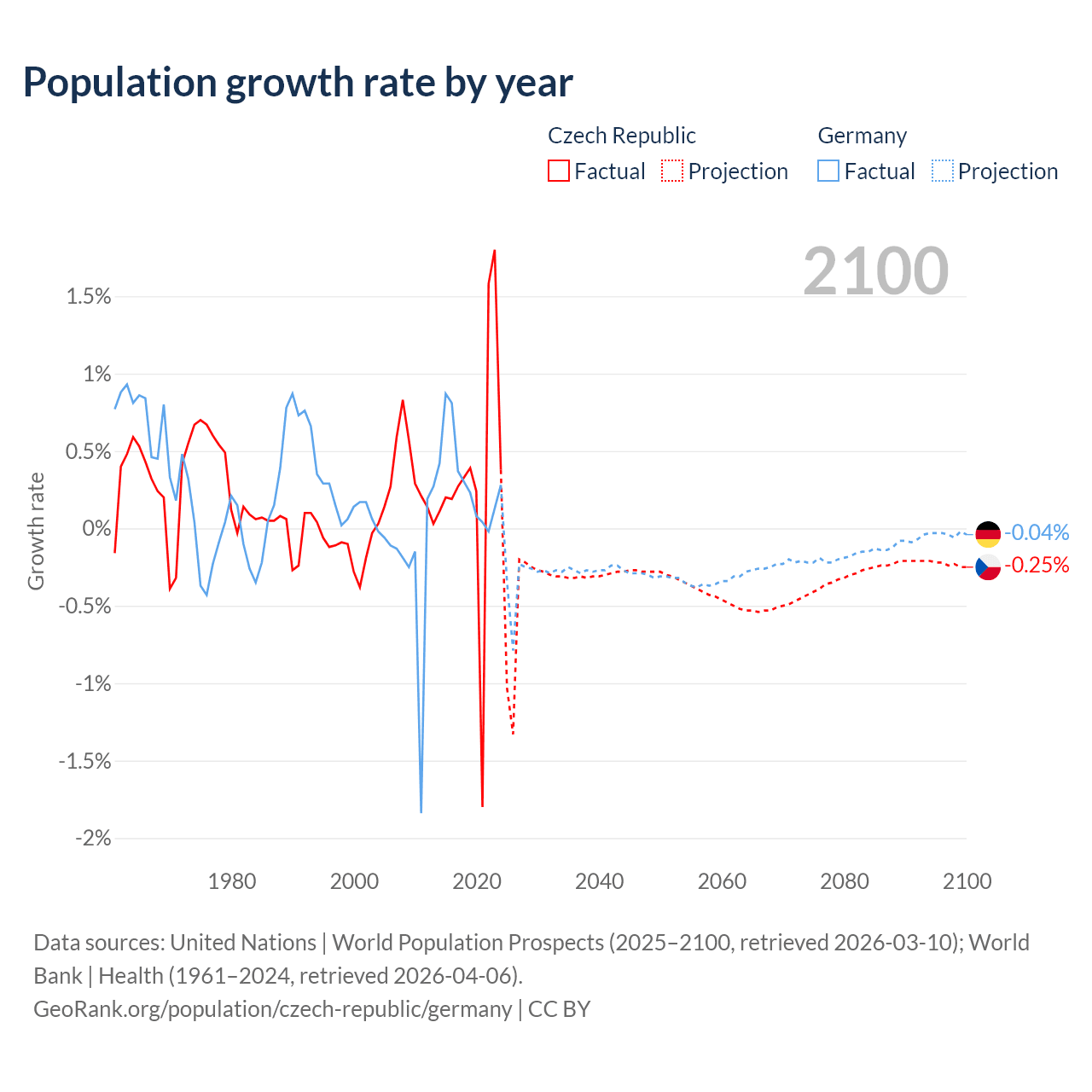 Data sources: World Bank | Health (1960–2024, retrieved 2026-04-06); United Nations | World Population Prospects (1960–2026, retrieved 2026-03-10); U.S. Census Bureau (1960–2025, retrieved 2026-02-08); Central Intelligence Agency (CIA) (2000–2019, retrieved 2026-02-20).