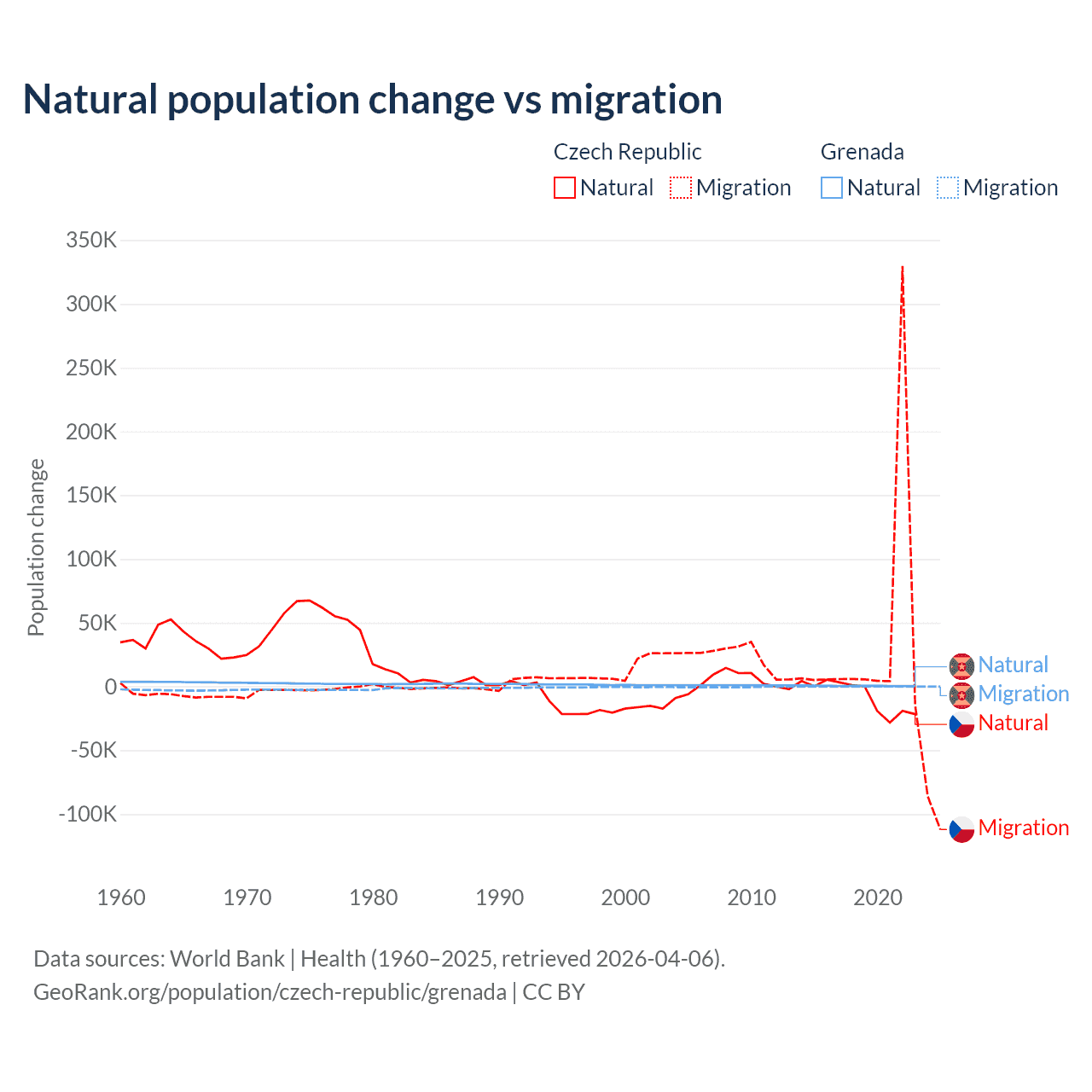 Over the last 10 years, 17.3% of the population change in the Czech Republic is from natural causes (a loss of 74,826 people) and 82.7% is from migration (a gain of 357,502 people). In Grenada 76% is from natural causes (a gain of 4,850 people) and 24% is from migration (a loss of 1,535 people).