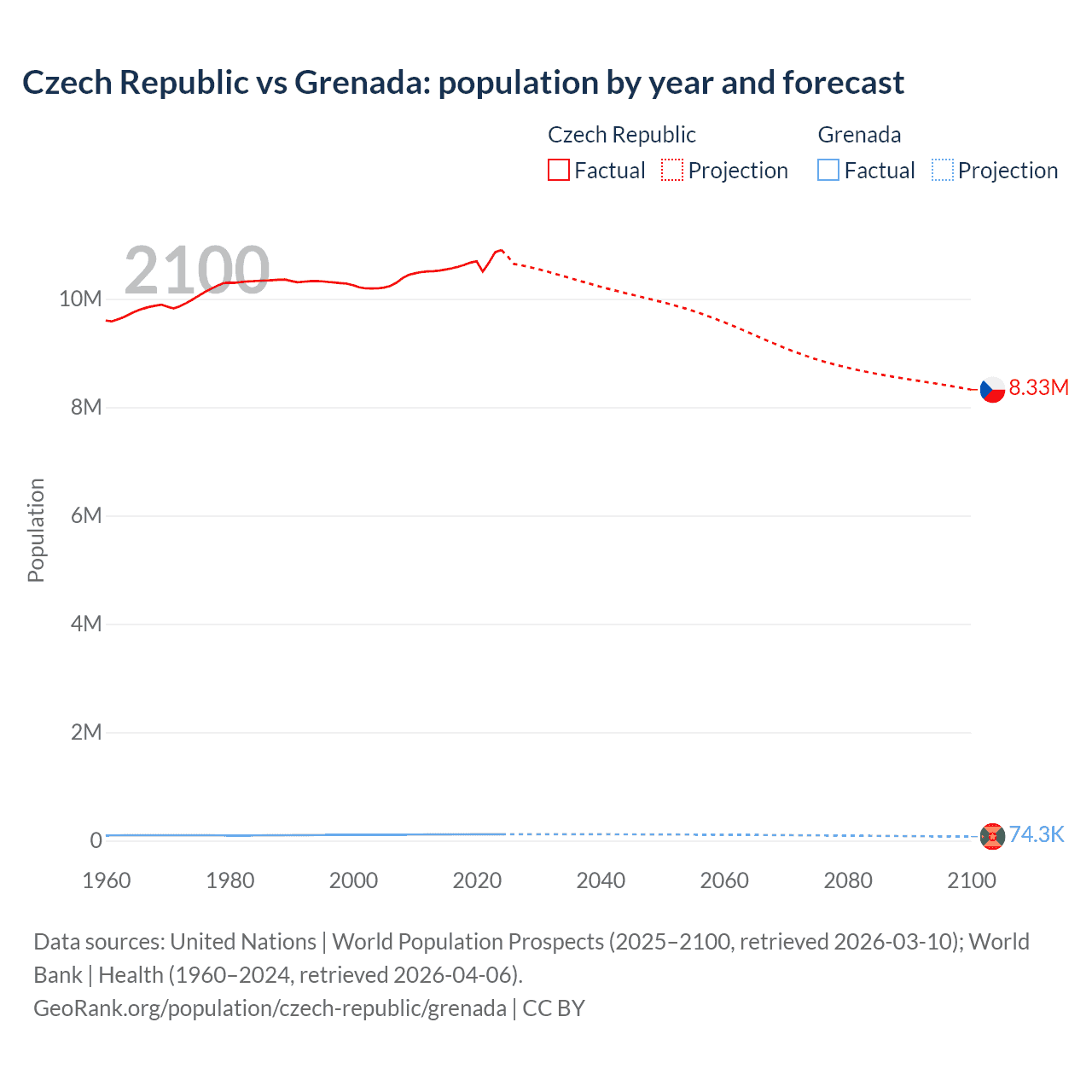 The latest officially reported population of the Czech Republic was 10,905,028 in 2024 vs 117,207 people in Grenada in 2024. In 2026, based on the adjusted UN estimation, the current Czech Republic's population is 10,649,126 people compared to 117,407 in Grenada.