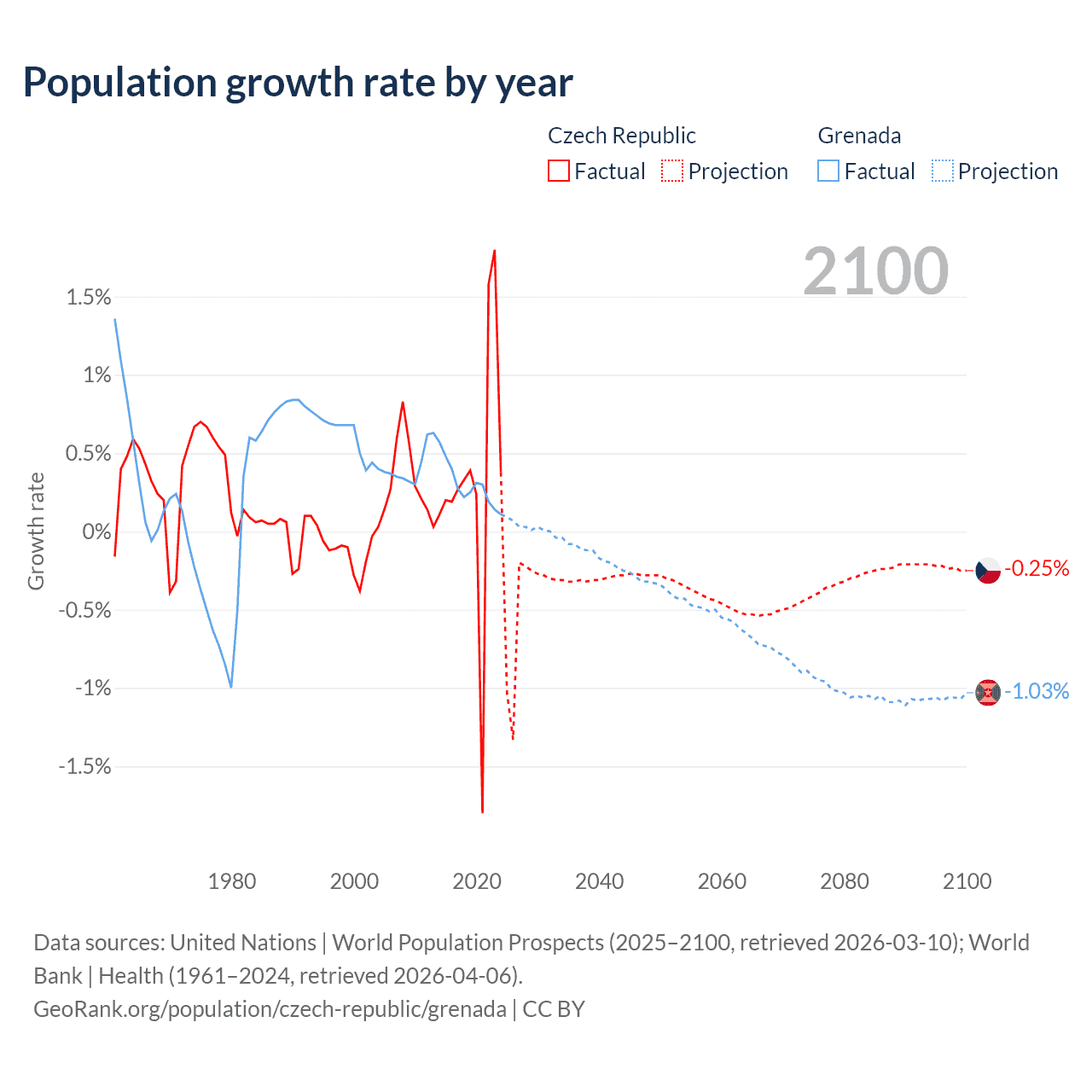 - For the last 10 years, the Czech Republic has had an average growth rate of +0.34% per year vs +0.29% in Grenada.