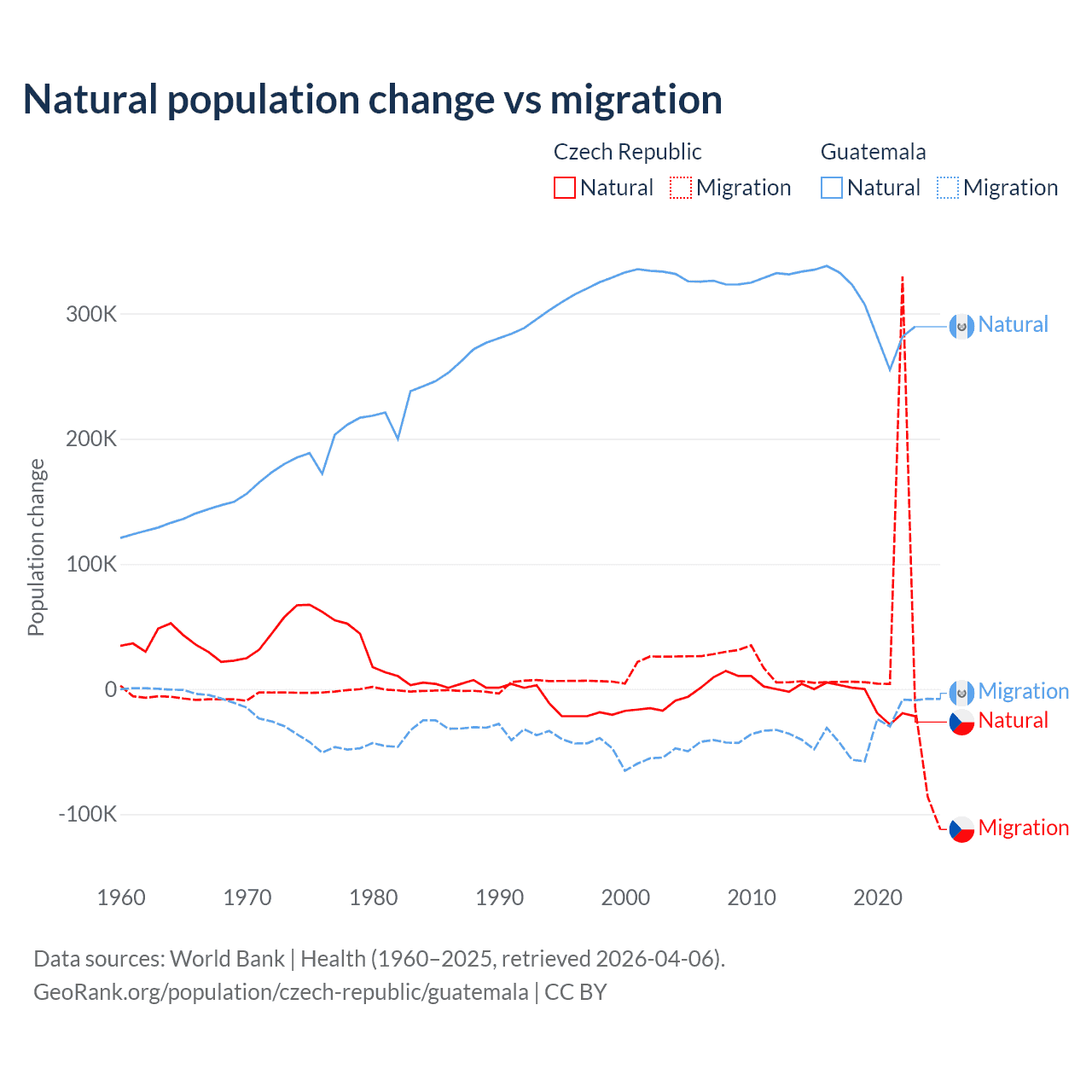 Over the last 10 years, 17.3% of the population change in the Czech Republic is from natural causes (a loss of 74,826 people) and 82.7% is from migration (a gain of 357,502 people). In Guatemala 89.8% is from natural causes (a gain of 3,077,847 people) and 10.2% is from migration (a loss of 347,818 people).