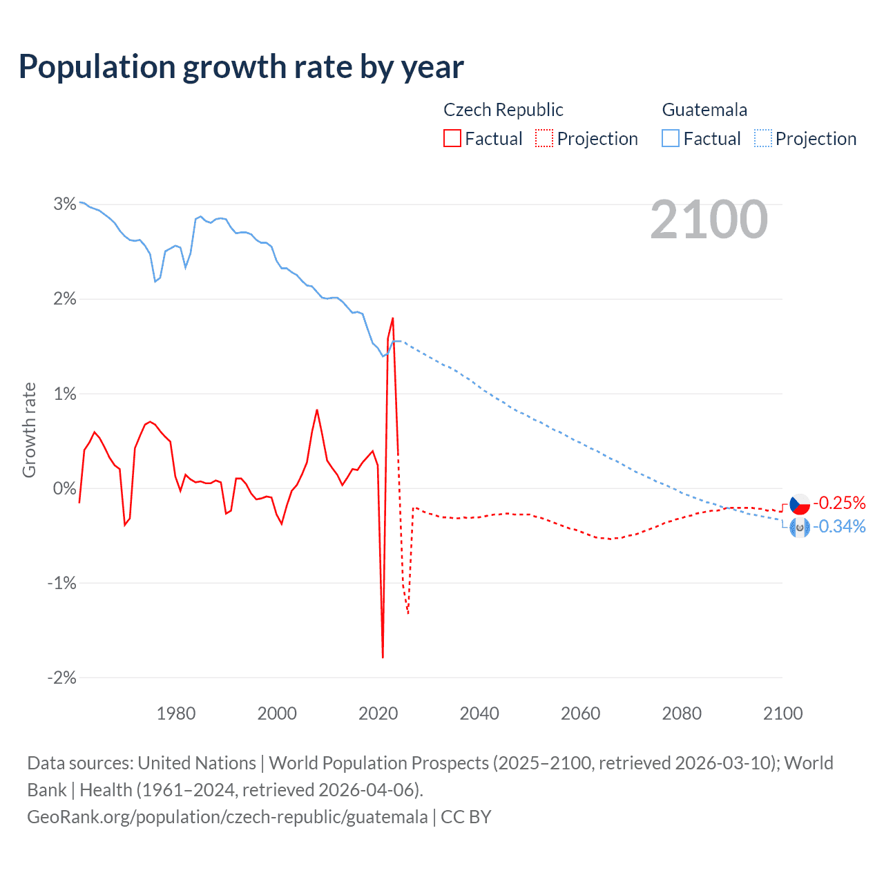 - For the last 10 years, the Czech Republic has had an average growth rate of +0.34% per year vs +1.64% in Guatemala.