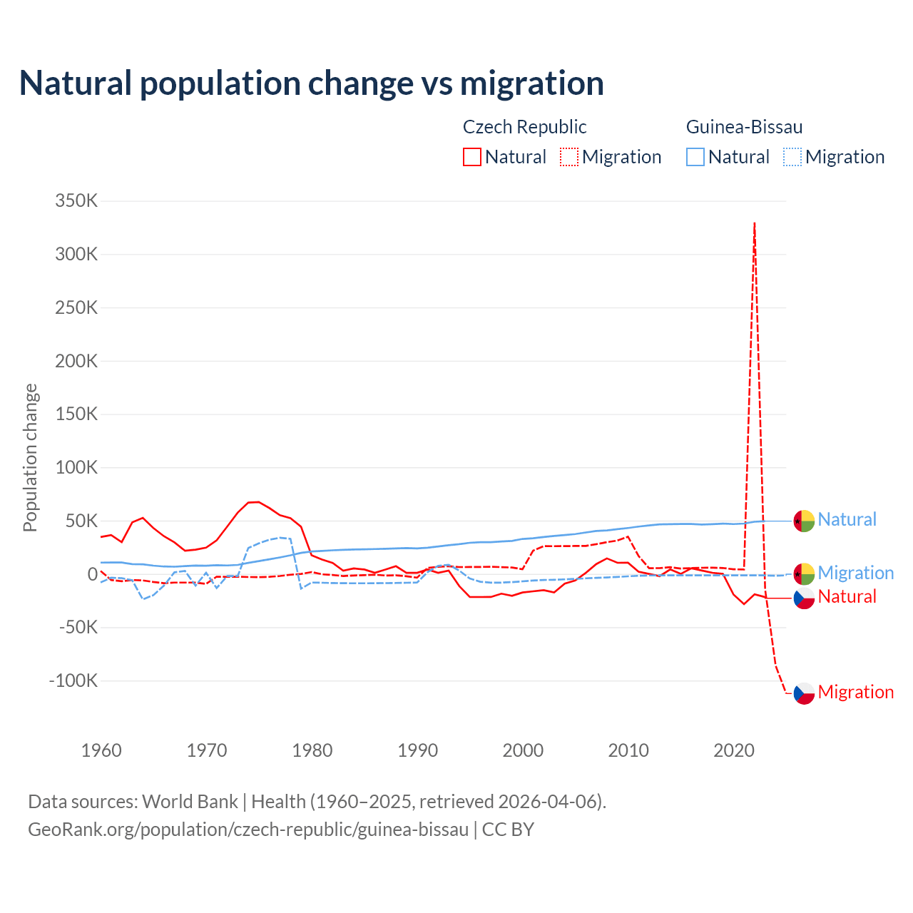 Over the last 10 years, 17.3% of the population change in the Czech Republic is from natural causes (a loss of 74,826 people) and 82.7% is from migration (a gain of 357,502 people). In Guinea-Bissau 97.1% is from natural causes (a gain of 472,826 people) and 2.87% is from migration (a loss of 13,956 people).