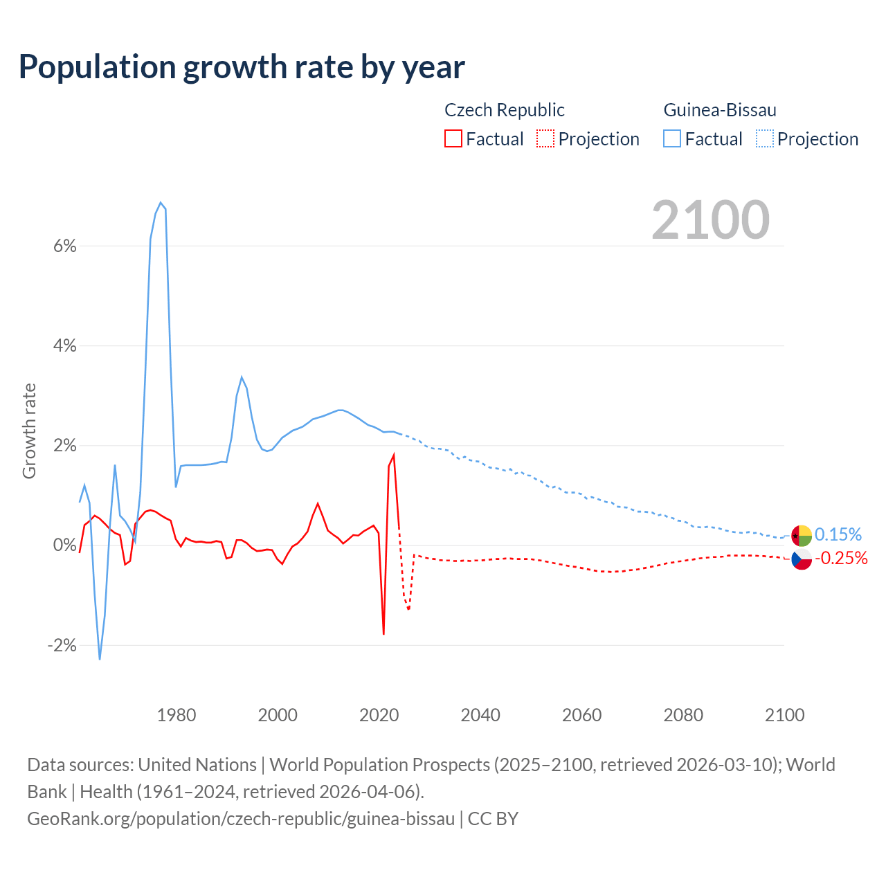 - For the last 10 years, the Czech Republic has had an average growth rate of +0.34% per year vs +2.4% in Guinea-Bissau.