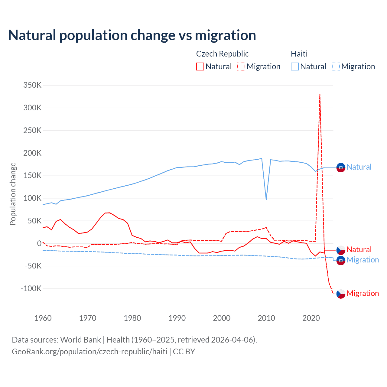 Over the last 10 years, 17.3% of the population change in the Czech Republic is from natural causes (a loss of 74,826 people) and 82.7% is from migration (a gain of 357,502 people). In Haiti 83.9% is from natural causes (a gain of 1,740,319 people) and 16.1% is from migration (a loss of 333,076 people).