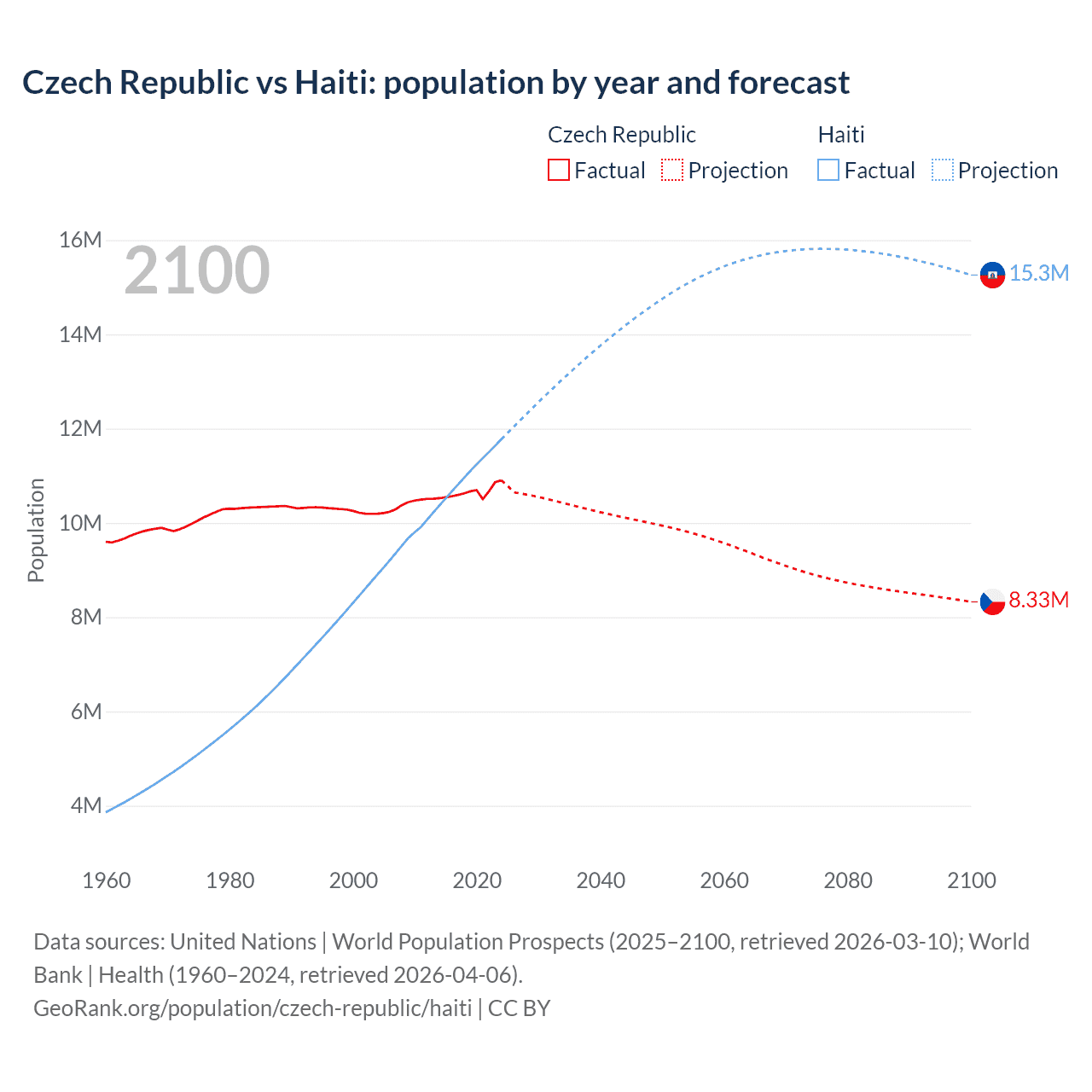 The latest officially reported population of the Czech Republic was 10,905,028 in 2024 vs 11,772,557 people in Haiti in 2024. In 2026, based on the adjusted UN estimation, the current Czech Republic's population is 10,649,126 people compared to 12,076,663 in Haiti.