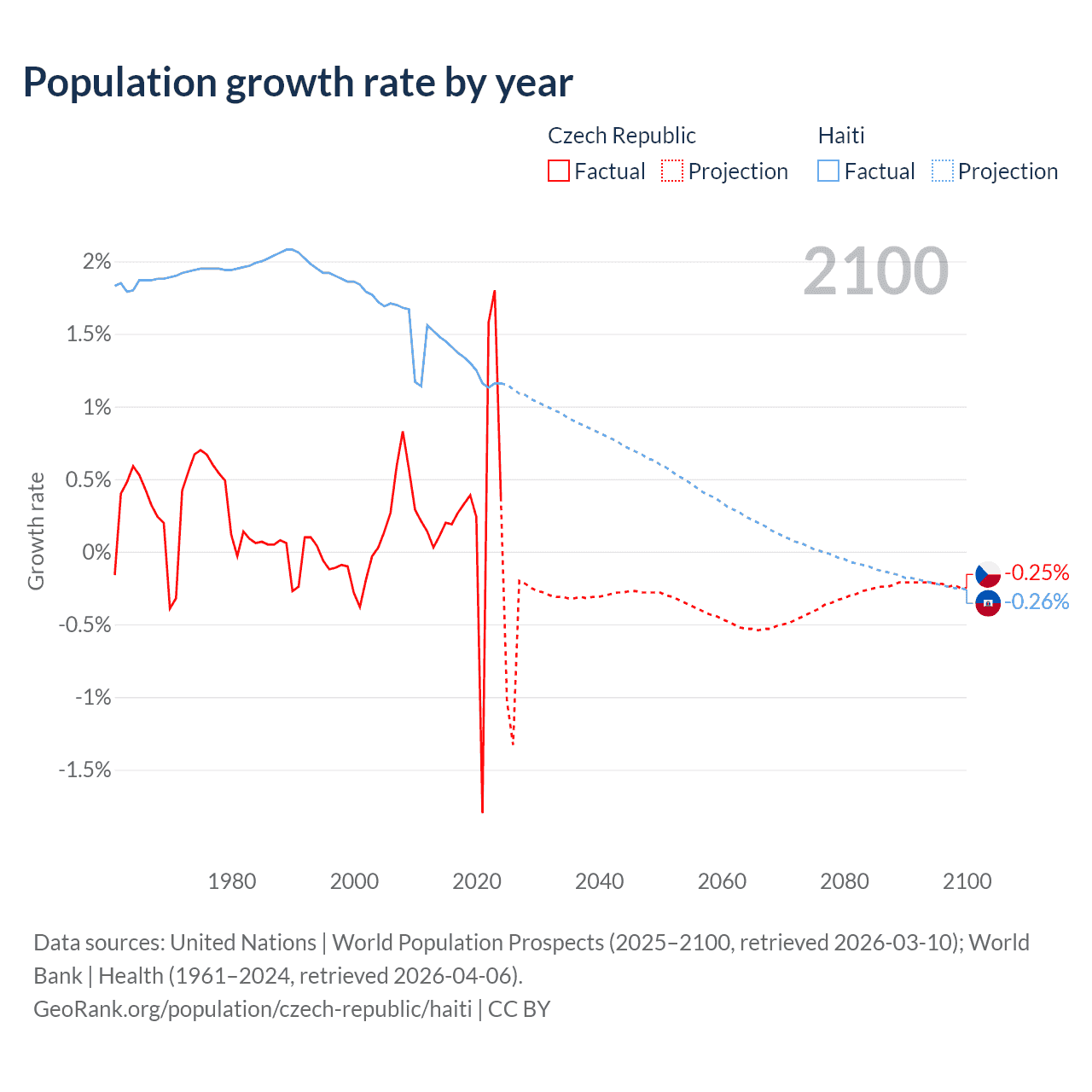 - For the last 10 years, the Czech Republic has had an average growth rate of +0.34% per year vs +1.29% in Haiti.