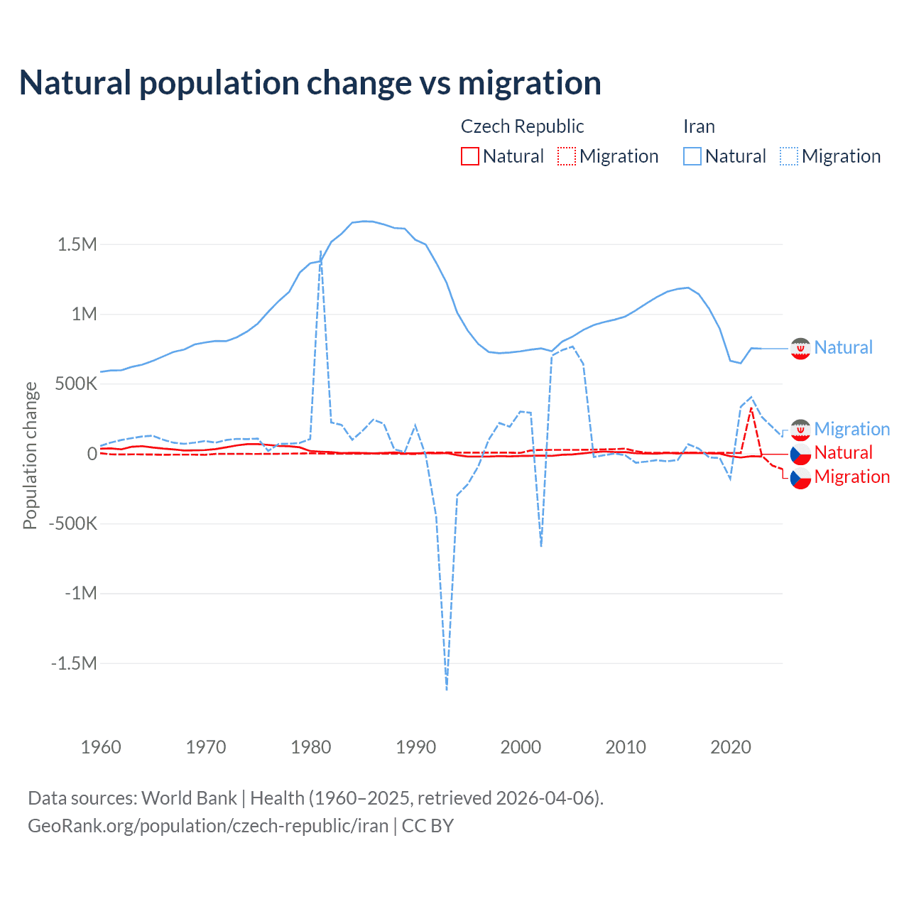 Over the last 10 years, 17.3% of the population change in the Czech Republic is from natural causes (a loss of 74,826 people) and 82.7% is from migration (a gain of 357,502 people). In Iran 92.5% is from natural causes (a gain of 9,405,860 people) and 7.46% is from migration (a gain of 757,979 people).