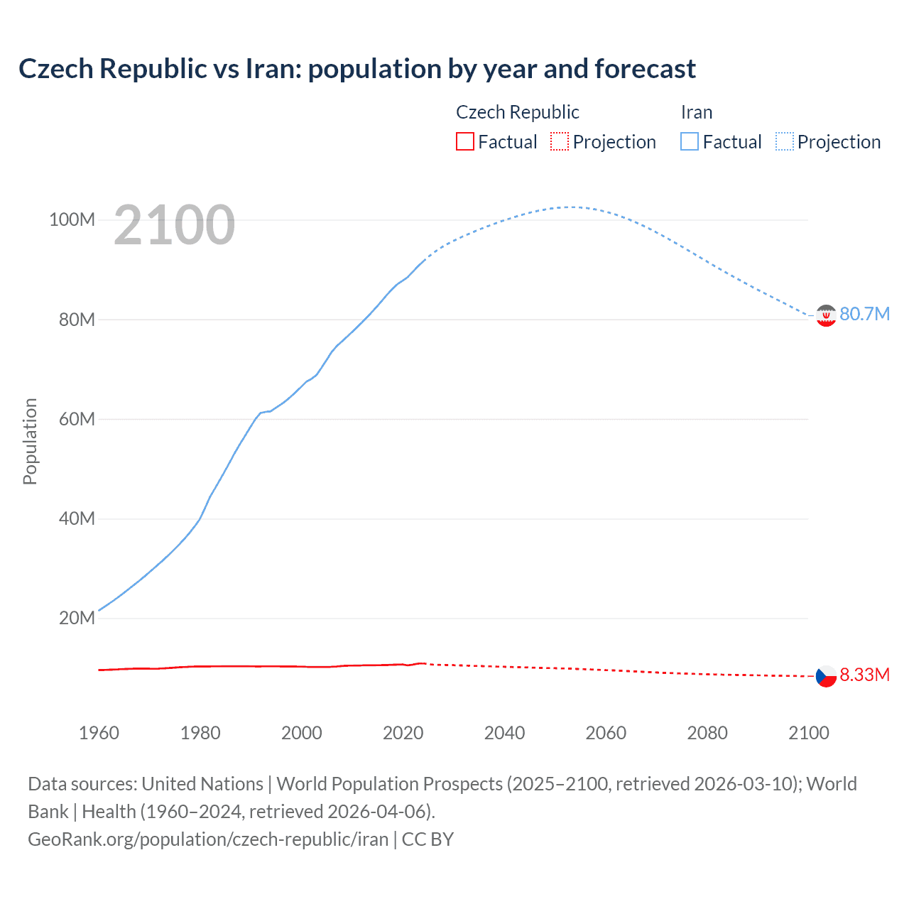 Czech Republic vs Iran: population by year and forecast
