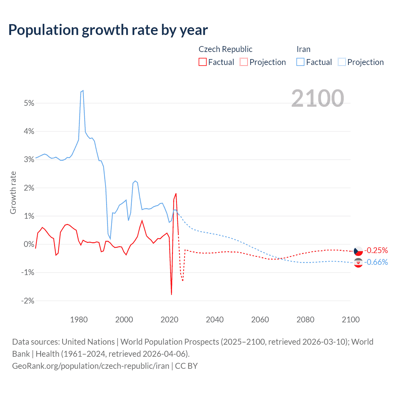 - For the last 10 years, the Czech Republic has had an average growth rate of +0.34% per year vs +1.19% in Iran.