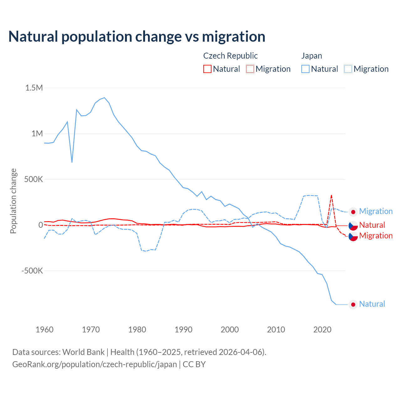 Over the last 10 years, 17.3% of the population change in the Czech Republic is from natural causes (a loss of 74,826 people) and 82.7% is from migration (a gain of 357,502 people). In Japan 73.6% is from natural causes (a loss of 5,178,838 people) and 26.4% is from migration (a gain of 1,860,103 people).