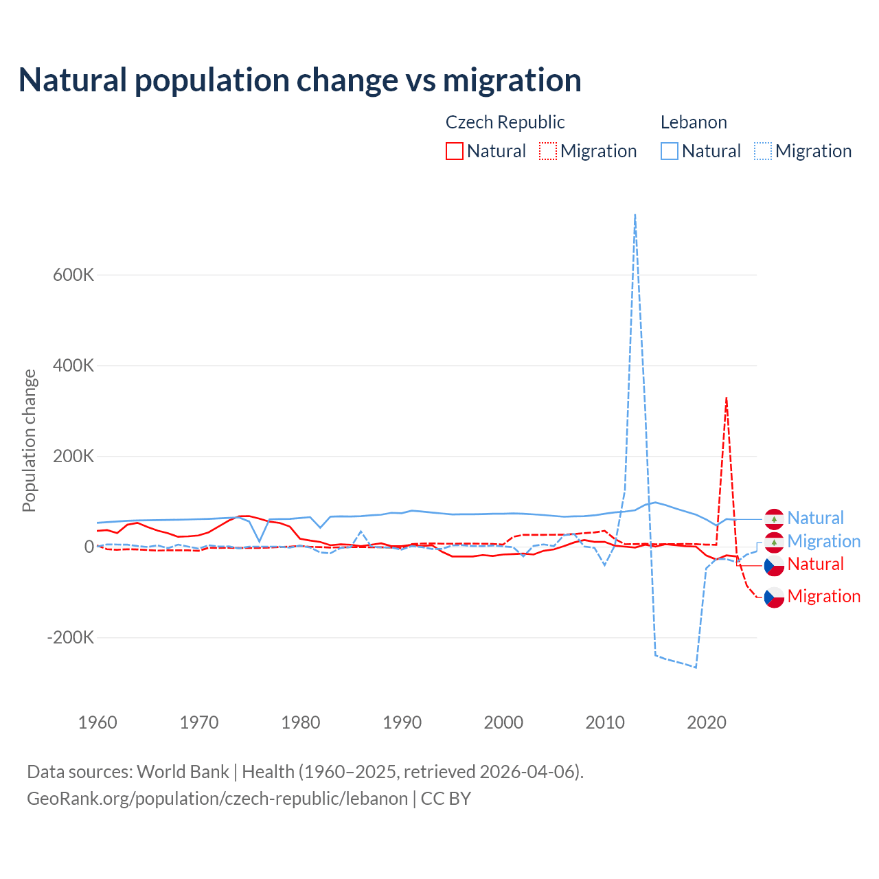 Over the last 10 years, 17.3% of the population change in the Czech Republic is from natural causes (a loss of 74,826 people) and 82.7% is from migration (a gain of 357,502 people). In Lebanon 40.1% is from natural causes (a gain of 739,256 people) and 59.9% is from migration (a loss of 1,103,772 people).