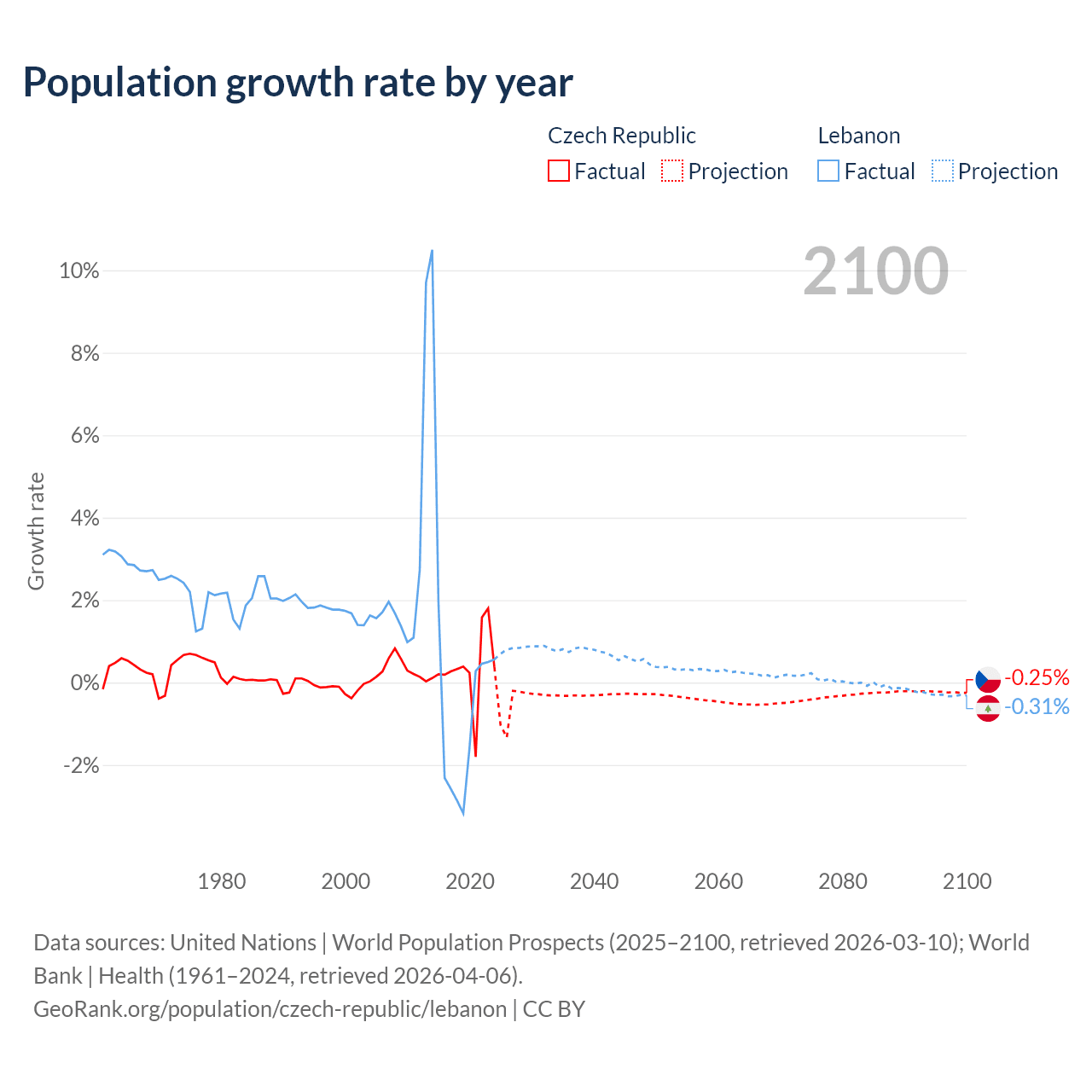 - For the last 10 years, the Czech Republic has had an average growth rate of +0.34% per year vs +0.16% in Lebanon.