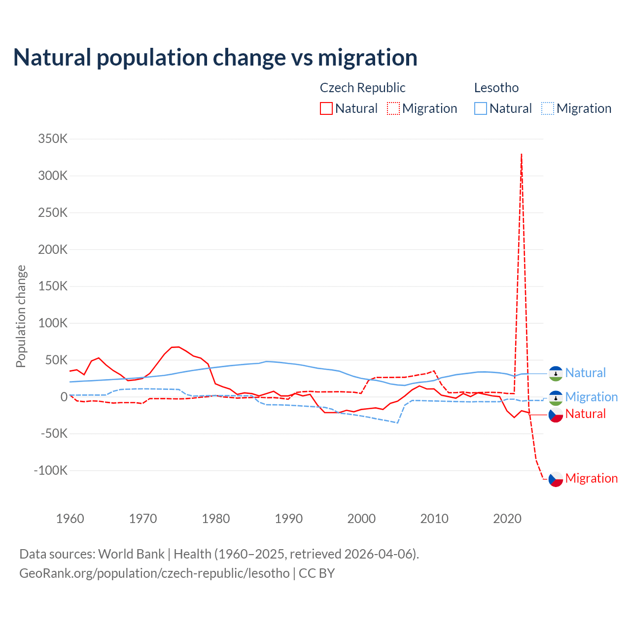 Over the last 10 years, 17.3% of the population change in the Czech Republic is from natural causes (a loss of 74,826 people) and 82.7% is from migration (a gain of 357,502 people). In Lesotho 84.2% is from natural causes (a gain of 315,836 people) and 15.8% is from migration (a loss of 59,457 people).