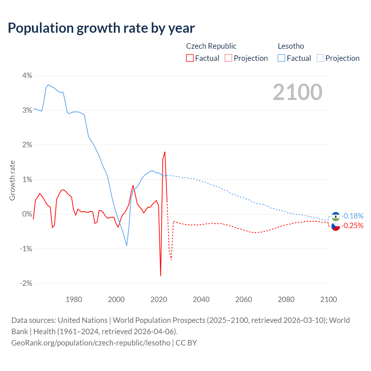 - For the last 10 years, the Czech Republic has had an average growth rate of +0.34% per year vs +1.17% in Lesotho.