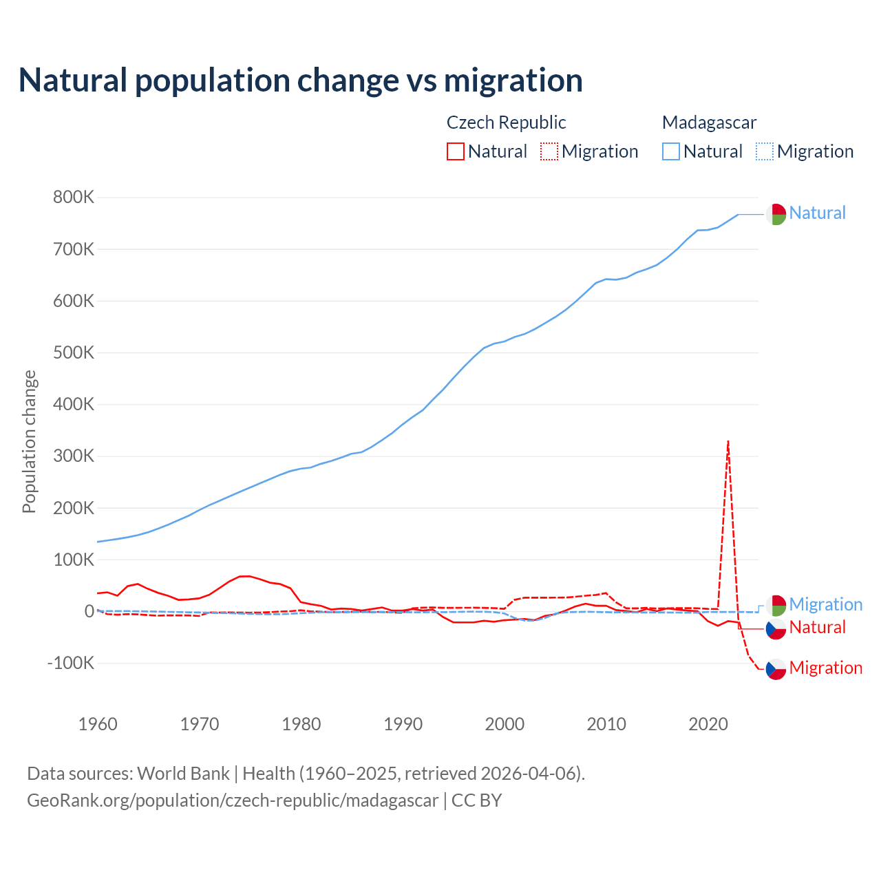 Over the last 10 years, 17.3% of the population change in the Czech Republic is from natural causes (a loss of 74,826 people) and 82.7% is from migration (a gain of 357,502 people). In Madagascar 99.7% is from natural causes (a gain of 7,165,578 people) and 0.31% is from migration (a loss of 22,384 people).