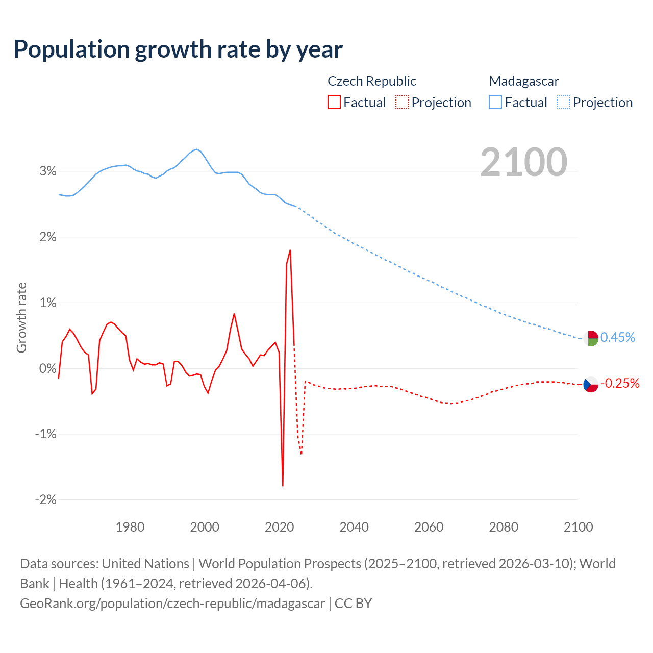 - For the last 10 years, the Czech Republic has had an average growth rate of +0.34% per year vs +2.6% in Madagascar.