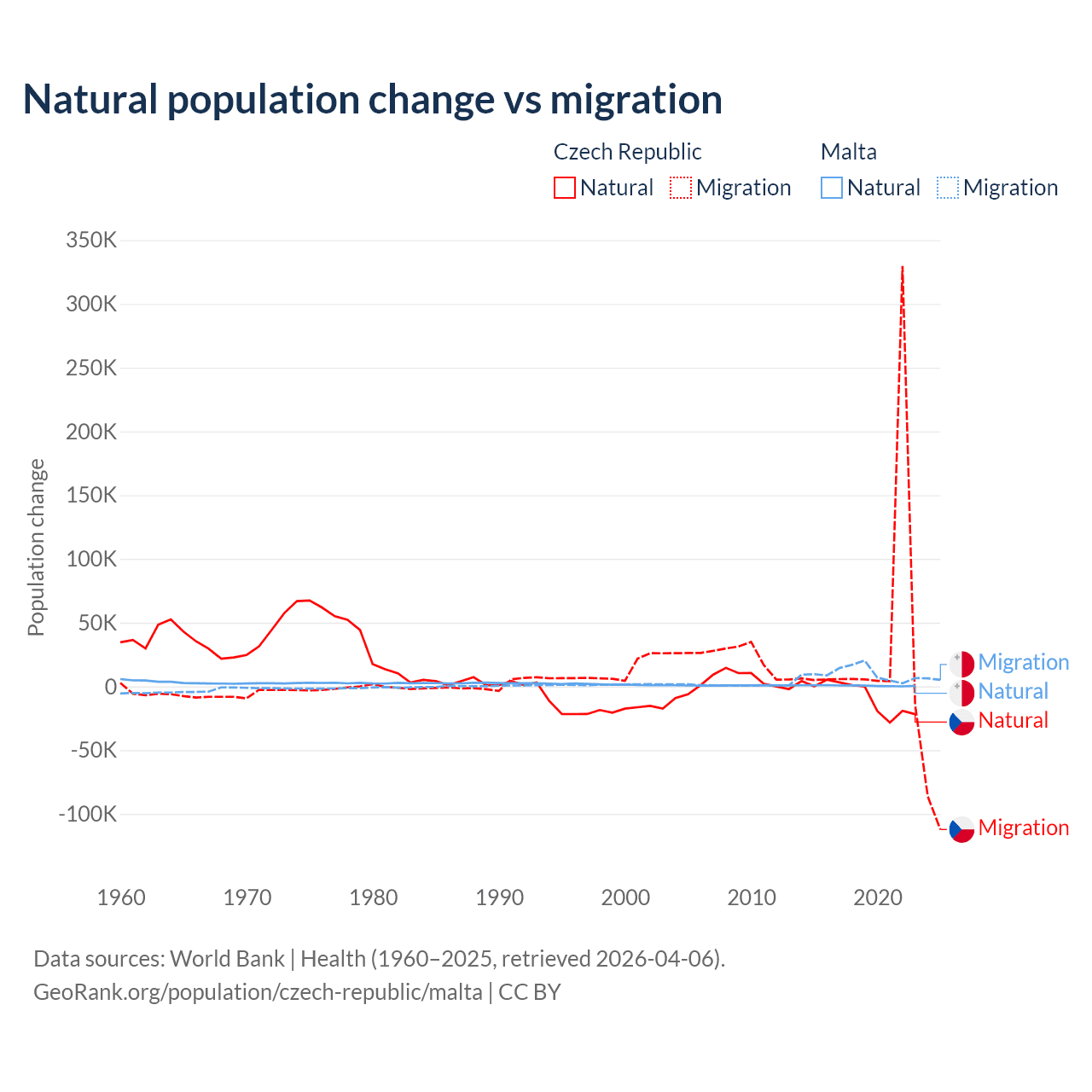 Over the last 10 years, 17.3% of the population change in the Czech Republic is from natural causes (a loss of 74,826 people) and 82.7% is from migration (a gain of 357,502 people). In Malta 5.84% is from natural causes (a gain of 6,181 people) and 94.2% is from migration (a gain of 99,652 people).
