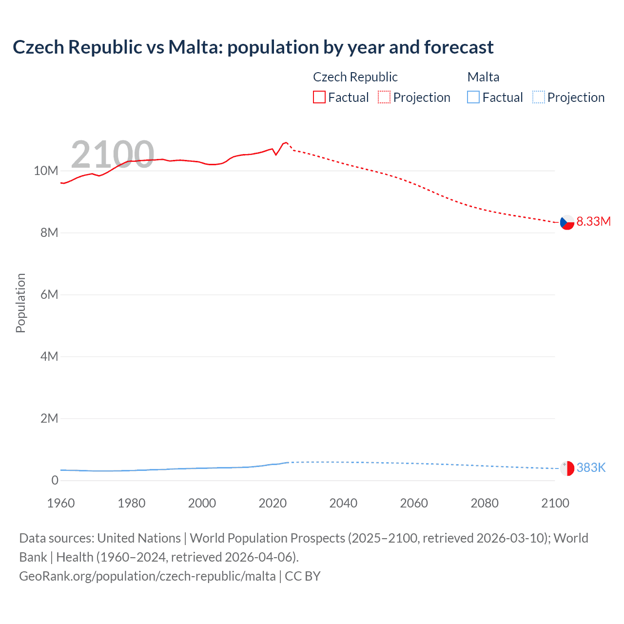Czech Republic vs Malta: population by year and forecast