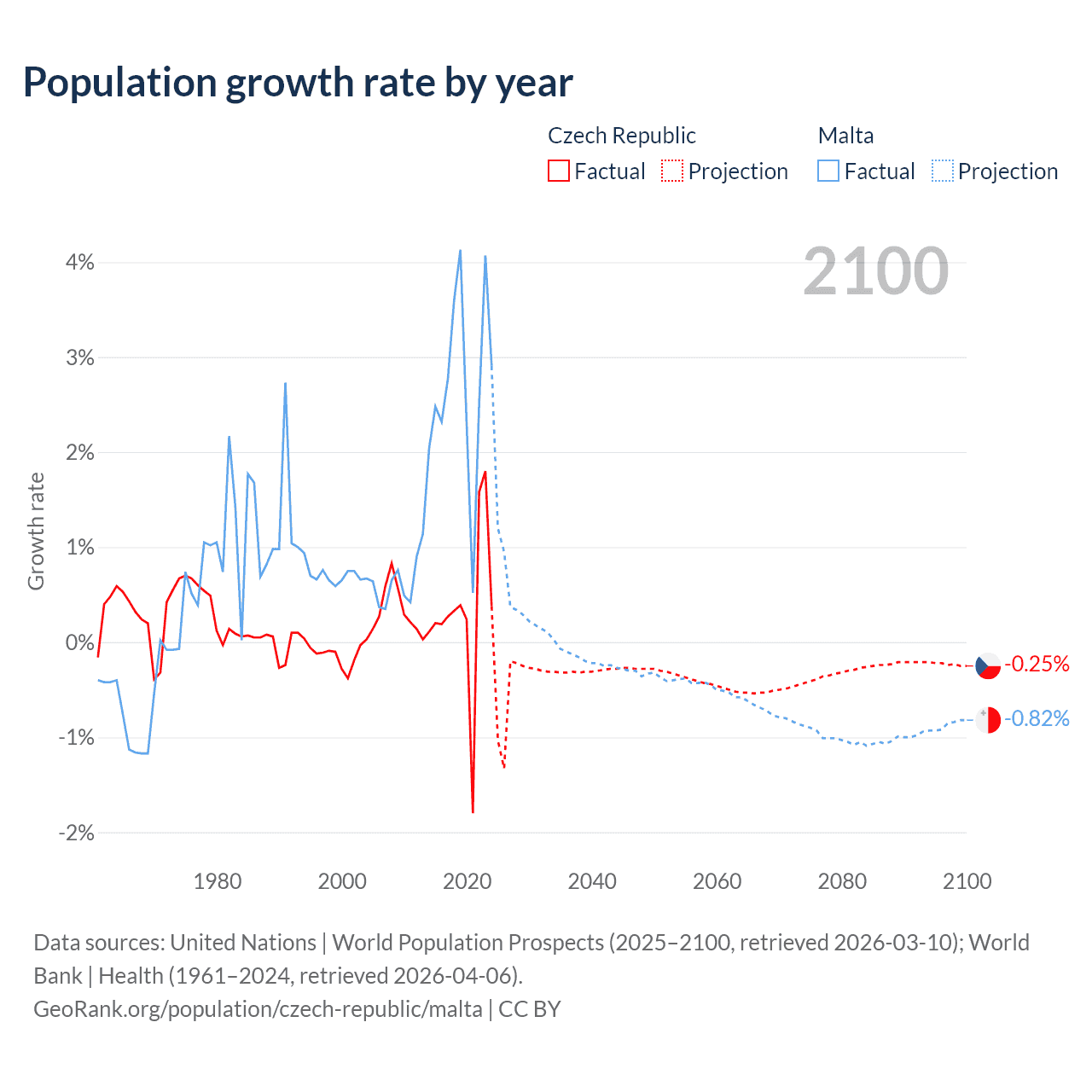 Data sources: World Bank | Health (1960–2024, retrieved 2026-04-06); United Nations | World Population Prospects (1960–2026, retrieved 2026-03-10); U.S. Census Bureau (1960–2025, retrieved 2026-02-08); Central Intelligence Agency (CIA) (2000–2019, retrieved 2026-02-20).
