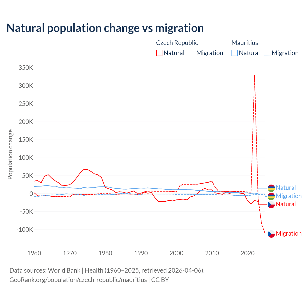Over the last 10 years, 17.3% of the population change in the Czech Republic is from natural causes (a loss of 74,826 people) and 82.7% is from migration (a gain of 357,502 people). In Mauritius 30.9% is from natural causes (a gain of 19,327 people) and 69.1% is from migration (a loss of 43,294 people).