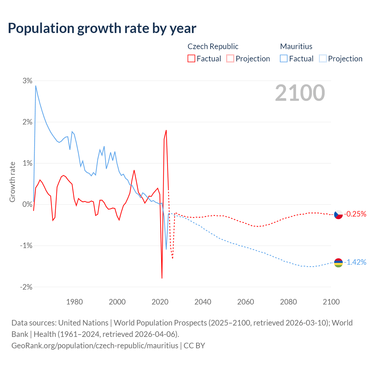 - For the last 10 years, the Czech Republic has had an average growth rate of +0.34% per year vs -0.09% in Mauritius.