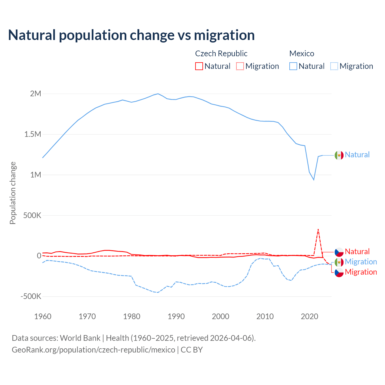 Over the last 10 years, 17.3% of the population change in the Czech Republic is from natural causes (a loss of 74,826 people) and 82.7% is from migration (a gain of 357,502 people). In Mexico 87.5% is from natural causes (a gain of 13,080,136 people) and 12.5% is from migration (a loss of 1,876,544 people).