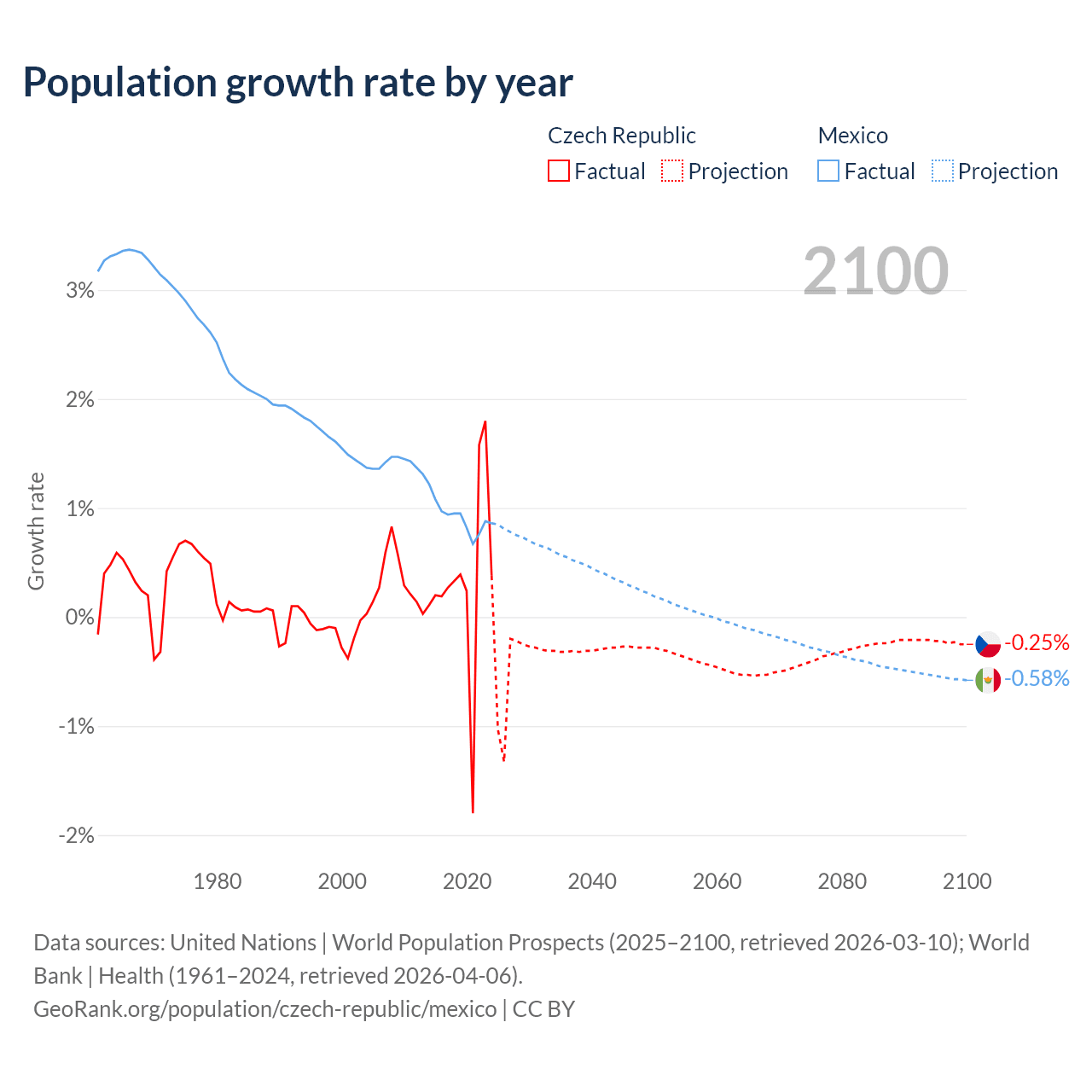 - For the last 10 years, the Czech Republic has had an average growth rate of +0.34% per year vs +0.92% in Mexico.