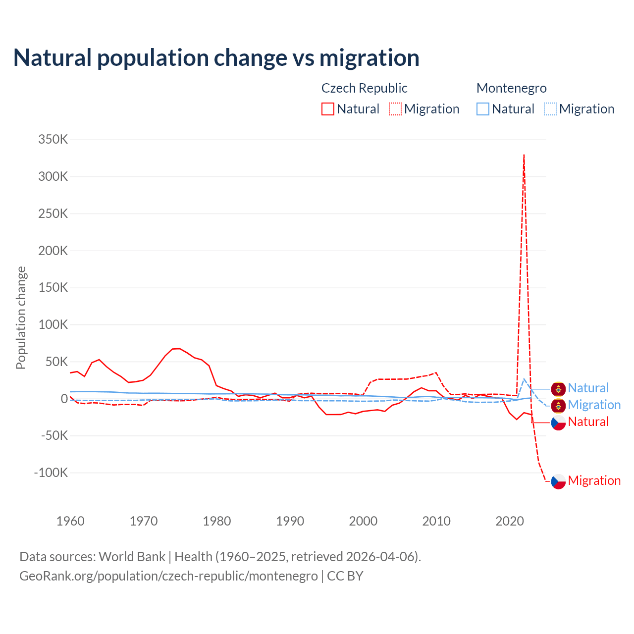 Over the last 10 years, 17.3% of the population change in the Czech Republic is from natural causes (a loss of 74,826 people) and 82.7% is from migration (a gain of 357,502 people). In Montenegro 52.4% is from natural causes (a gain of 4,501 people) and 47.6% is from migration (a gain of 4,095 people).