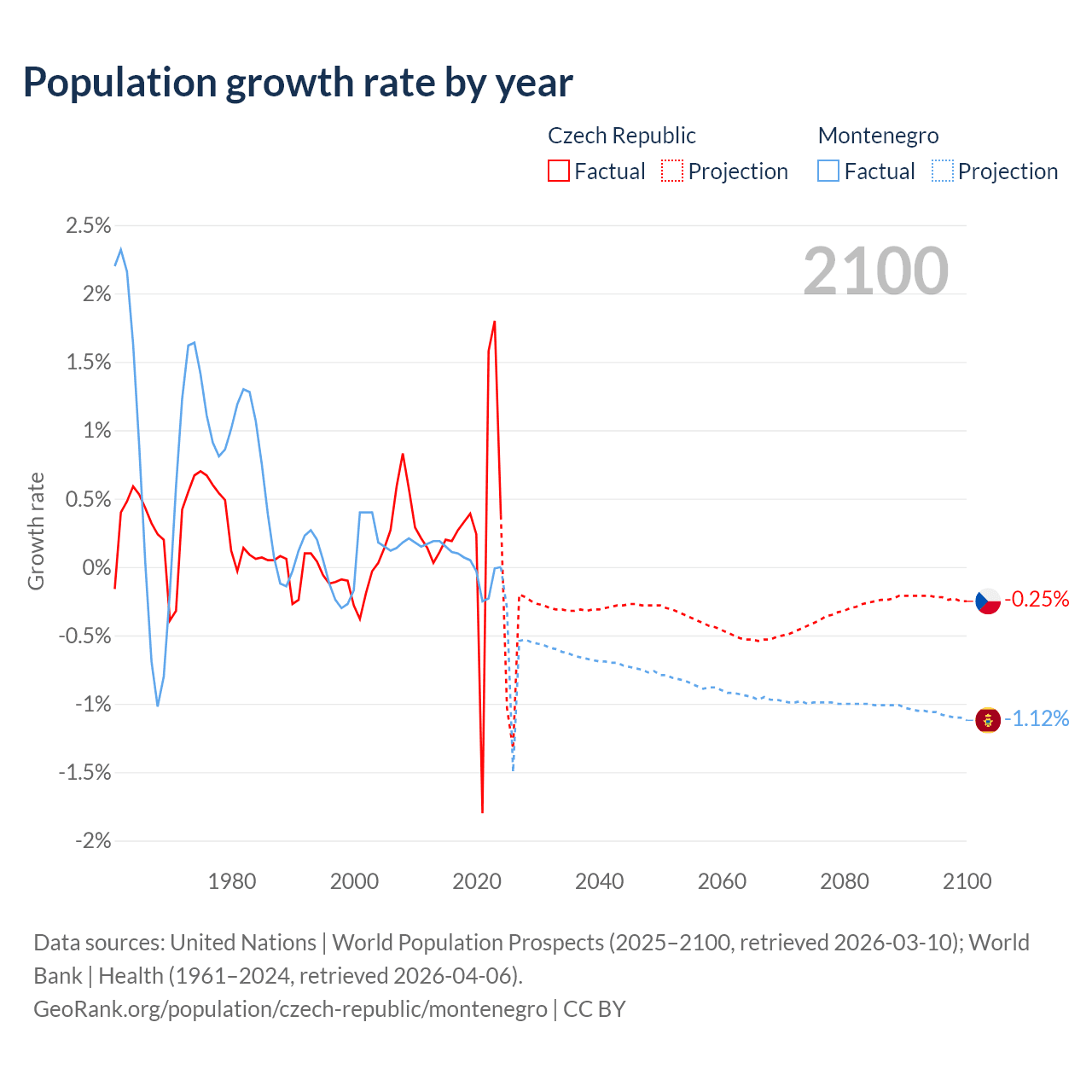 - For the last 10 years, the Czech Republic has had an average growth rate of +0.34% per year vs +0.01% in Montenegro.
