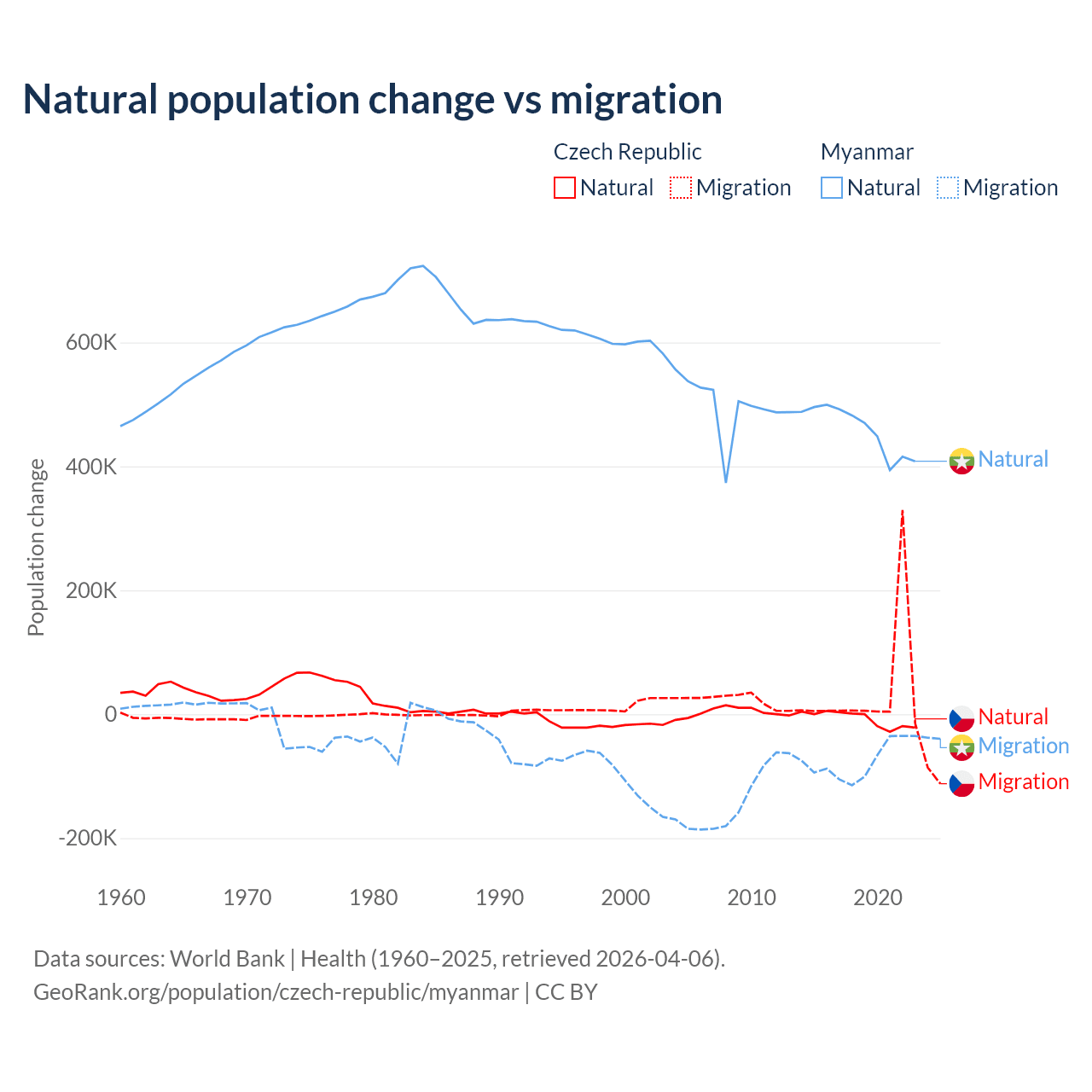 Over the last 10 years, 17.3% of the population change in the Czech Republic is from natural causes (a loss of 74,826 people) and 82.7% is from migration (a gain of 357,502 people). In Myanmar 86% is from natural causes (a gain of 4,594,615 people) and 14% is from migration (a loss of 749,272 people).
